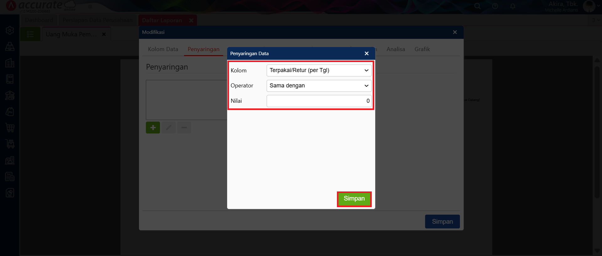 - Selanjutnya, pada bagian Kolom pilih Uang Muka Terpakai/Retur dan pada bagian Operator pilih Sama dengan, lalu pada Nilai isikan nol (0). Kemudian, klik Simpan.