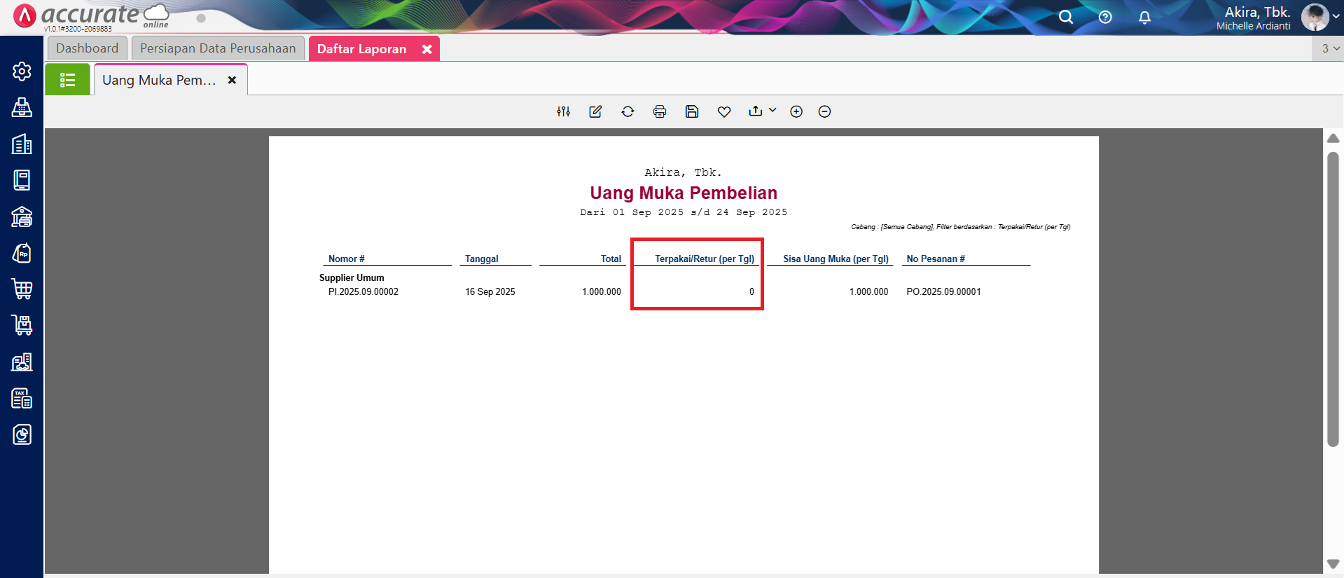 Laporan Uang Muka Pembelian menampilkan Uang Muka yang belum digunakan