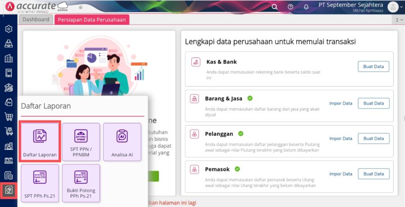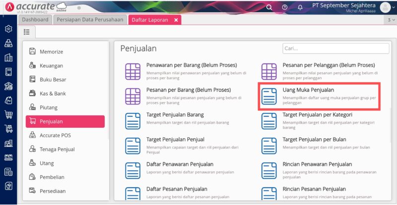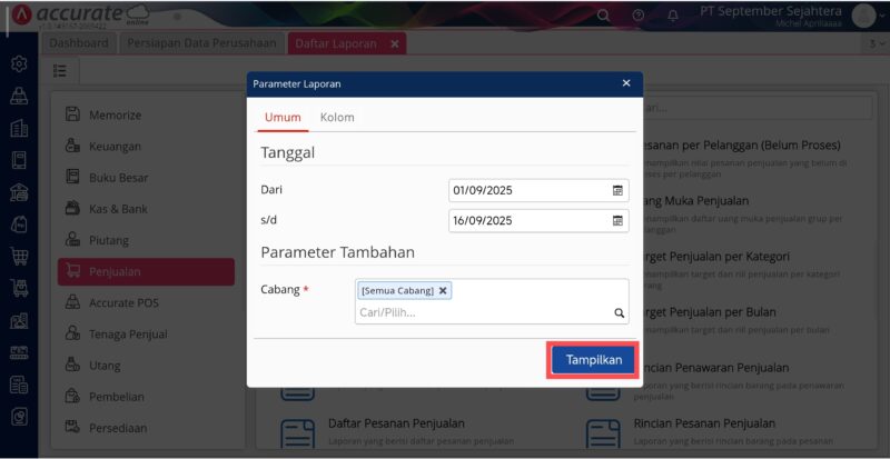 - Pilih laporan Penjualan | Uang Muka Penjualan dan isikan Parameter Laporan sesuai dengan kebutuhan, lalu klik Tampilkan.
