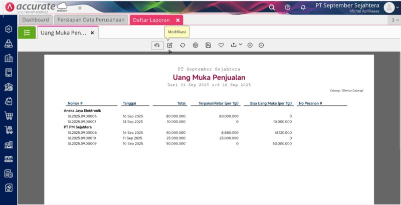 - Kemudian Simpan modifikasi tersebut, maka tampilan laporan Uang Muka Penjualan setelah modifikasi adalah sebagai berikut.