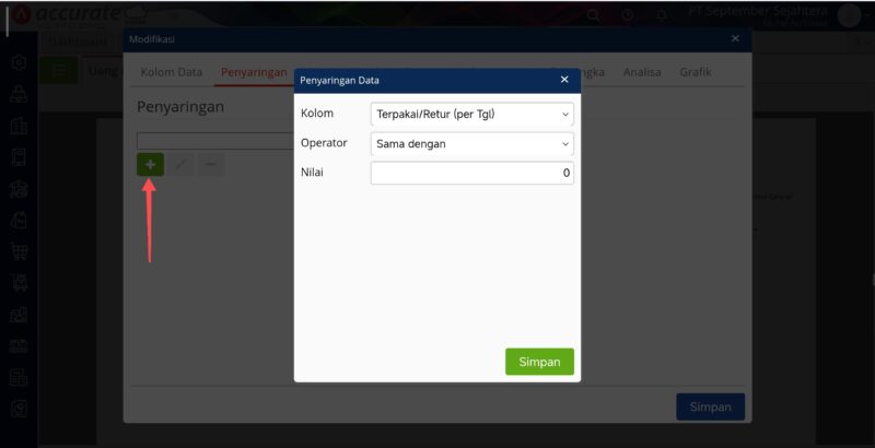 - Klik Modifikasi, lalu ke tab Penyaringan dan klik tombol Tambah (+). Pilih variabel Terpakai/Retur (per Tgl) dengan pilihan operator adalah Sama Dengan kemudian isikan angka 0 (nol) pada baris Nilai, lalu Simpan.