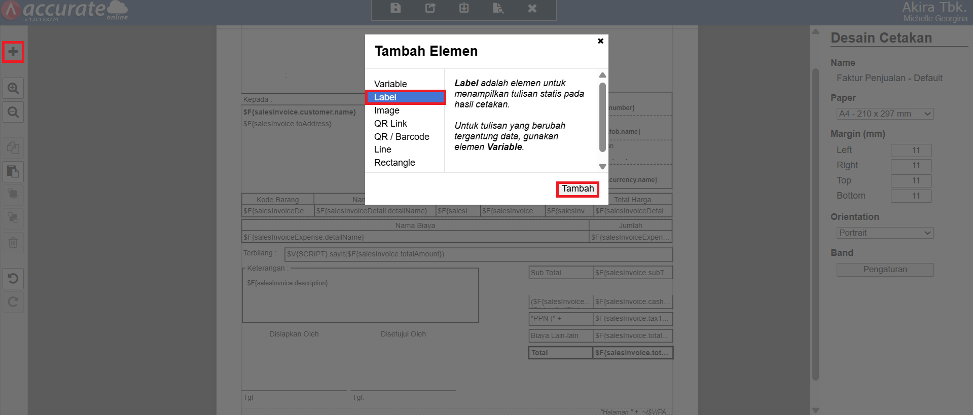 3. Tambah Elemen Label dengan klik tombol Tambah Elemen (+), lalu pilih Label | Tambah. Posisikan kolom Label tersebut pada bagian footer, lalu isikan Nama Label di kolom Text (misal, Uang Muka).