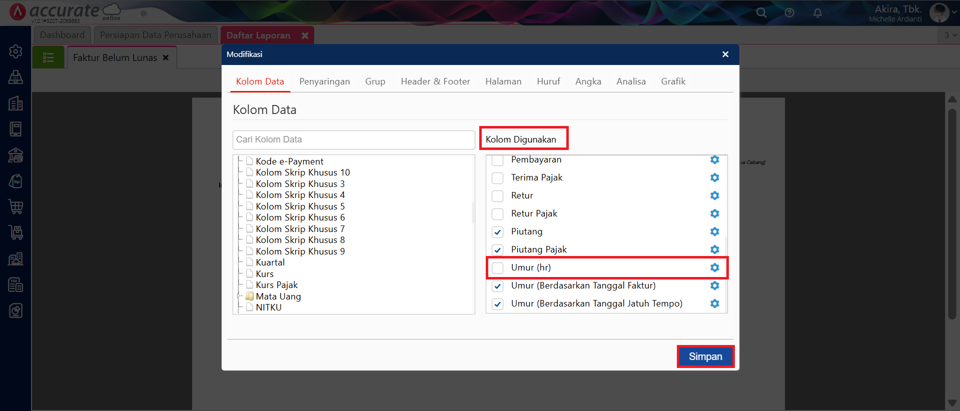 - Kemudian, jangan centang variable ‘Umur (hr)’ pada ‘Kolom Digunakan’, lalu klik Simpan.