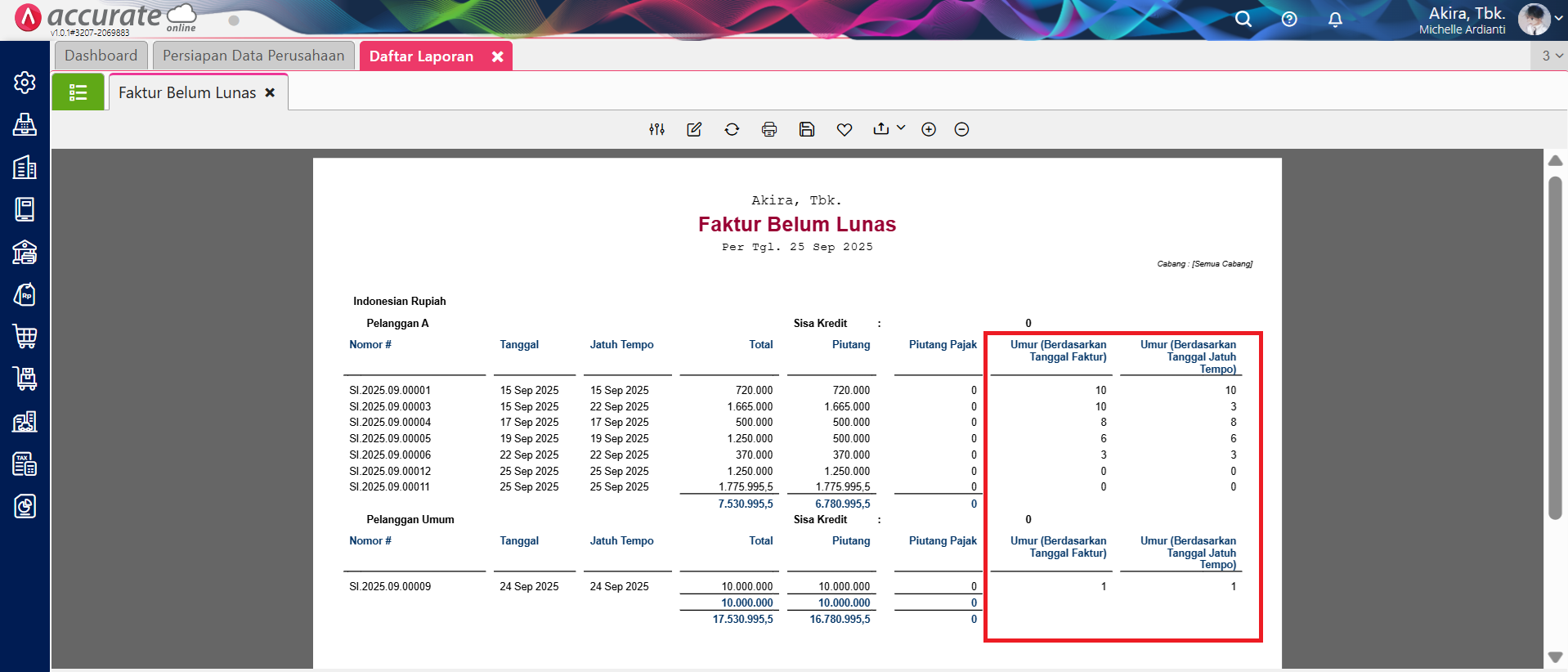- Dan berikut tampilan laporan Faktur Belum Lunas yang menampilkan informasi Umur berdasarkan Tanggal Faktur dan Tanggal Jatuh Tempo.