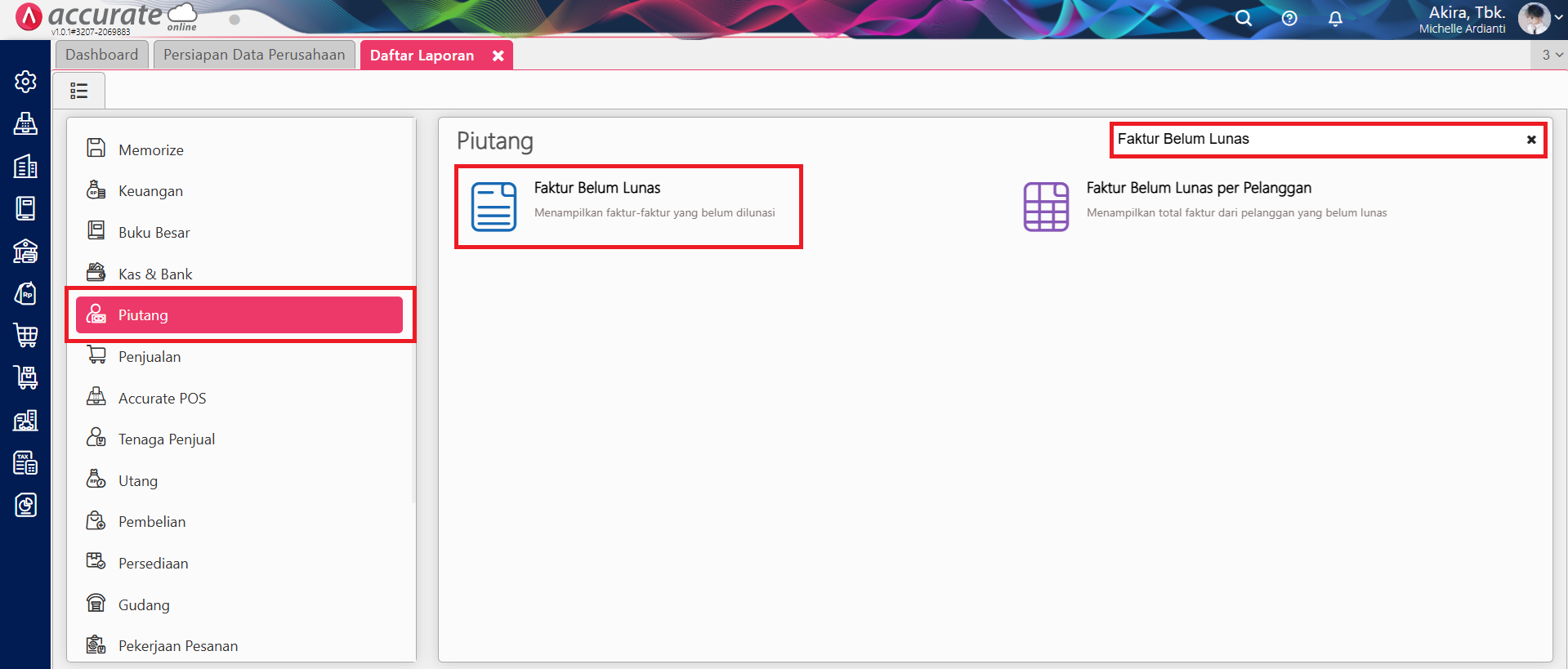 Lakukan pencarian atas laporan Faktur Belum Lunas