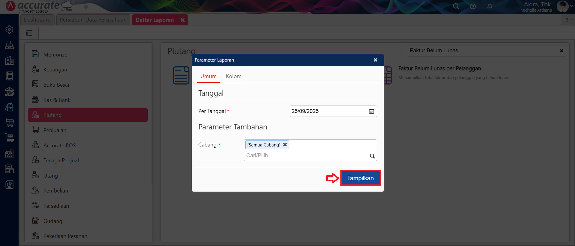 - Ke menu Daftar Laporan | Daftar Laporan | Piutang | Faktur Belum Lunas, dan atur parameter laporan seperti Tanggal dan Cabang sesuai kebutuhan, lalu klik Tampilkan.