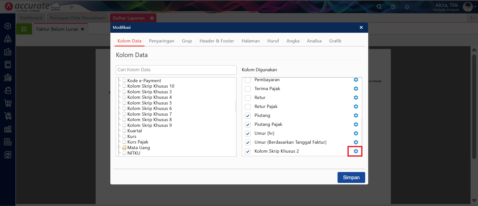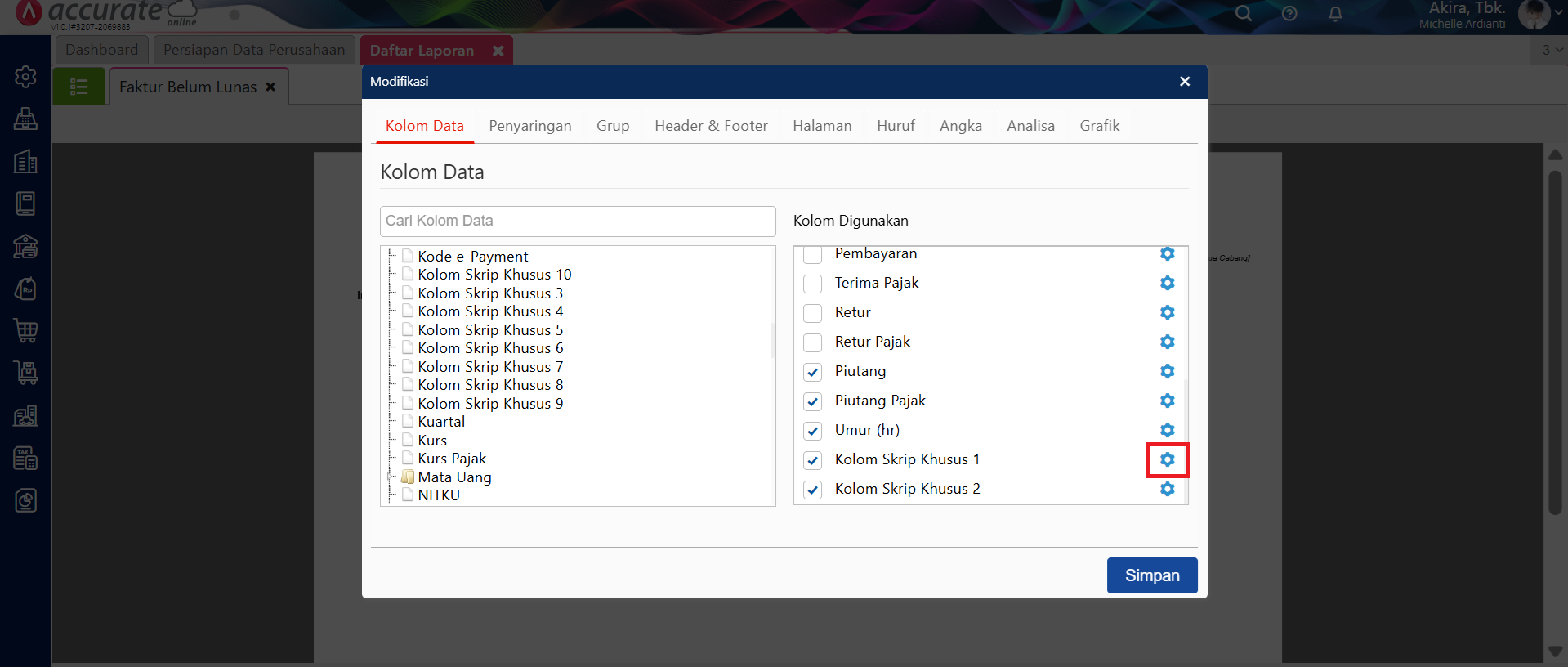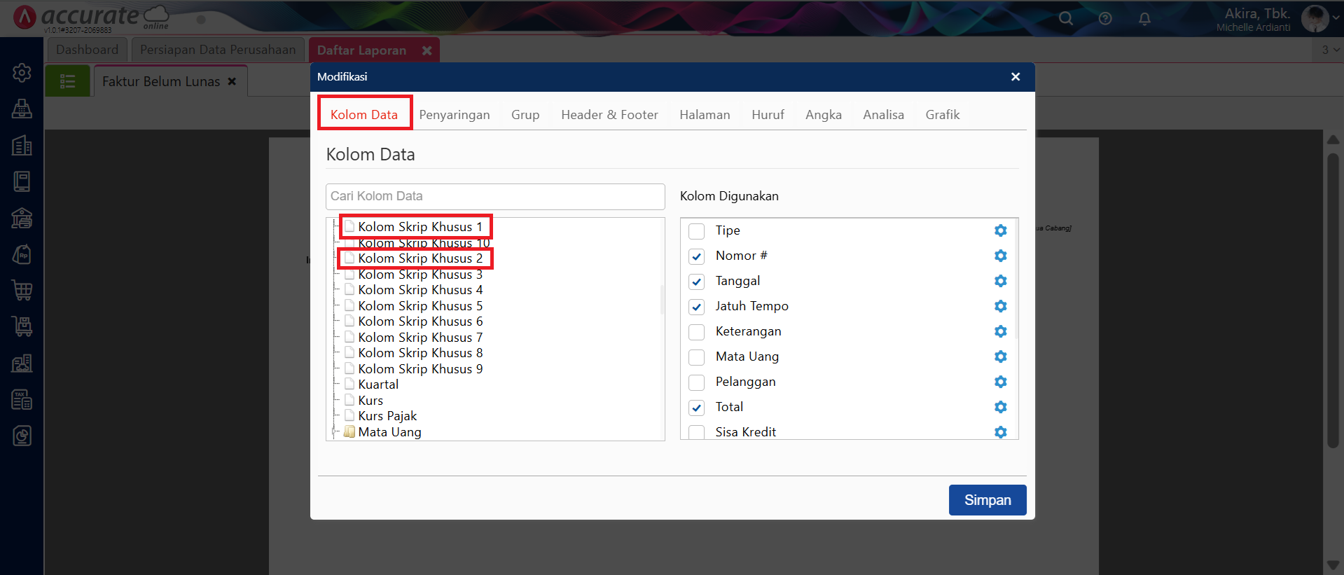 - Selanjutnya klik tombol Modifikasi, kemudian pada tab Kolom Data, cari dan tambahkan variable Kolom Skrip Khusus 1 dan Kolom Skrip Khusus 2, hingga tampil pada Kolom Digunakan.