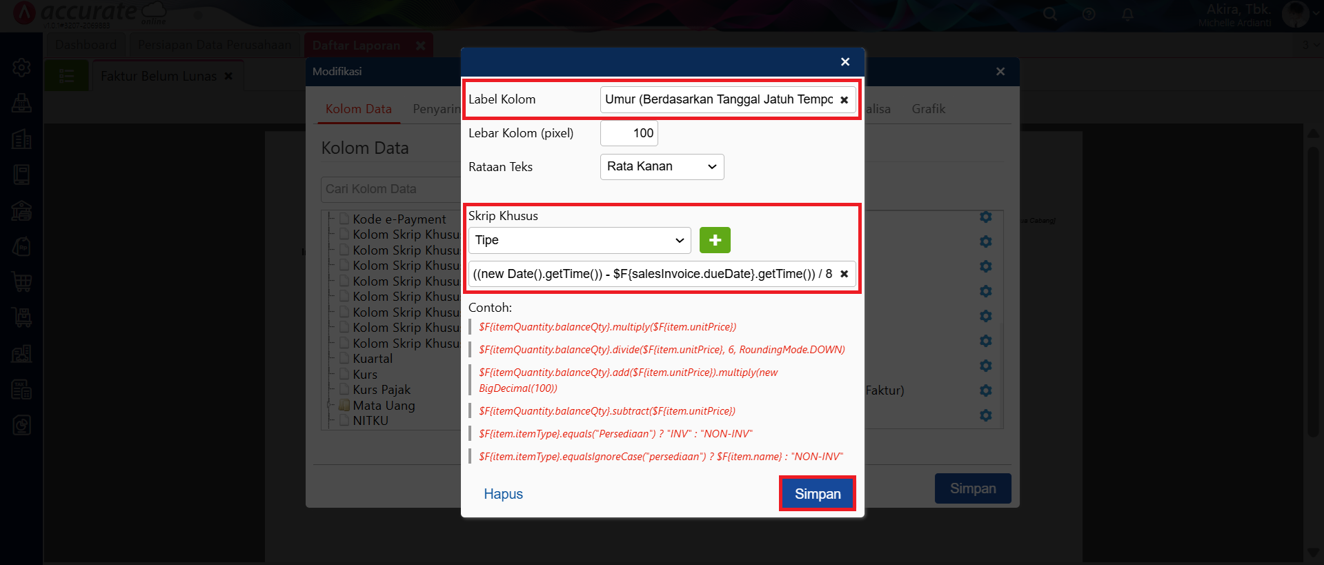 - Pada Kolom Skrip Khusus 1 digunakan untuk menampilkan data Umur Berdasarkan Tanggal Faktur, silahkan isikan dengan skrip rumus: ((new Date().getTime()) – $F{salesInvoice.transDate}.getTime()) / 86400000