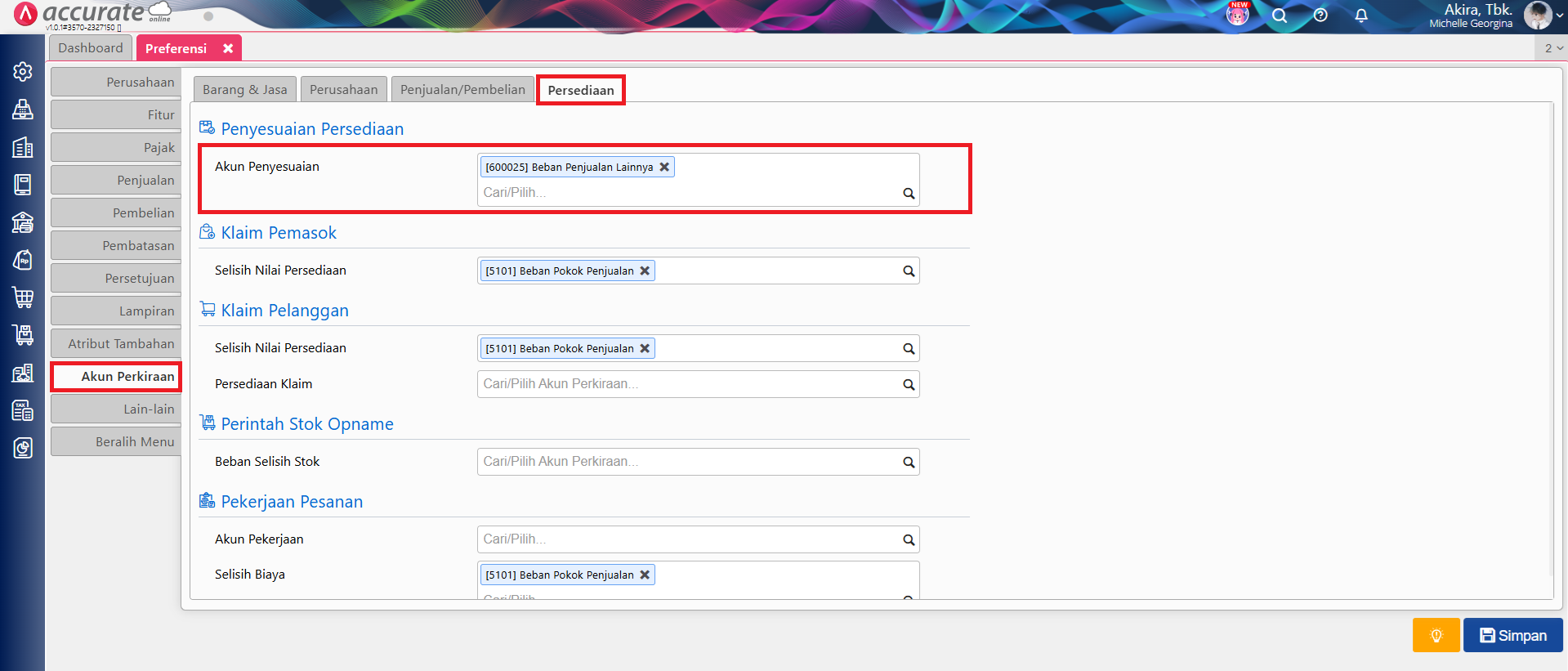 2. Selanjutnya isikan akun perkiraan biaya/beban yang akan digunakan pada transaksi Penyesuaian Persediaan, melalui menu Pengaturan | Preferensi | Akun Perkiraan | Persediaan | Penyesuaian Persediaan, isikan akunnya pada kolom Akun Penyesuaian.