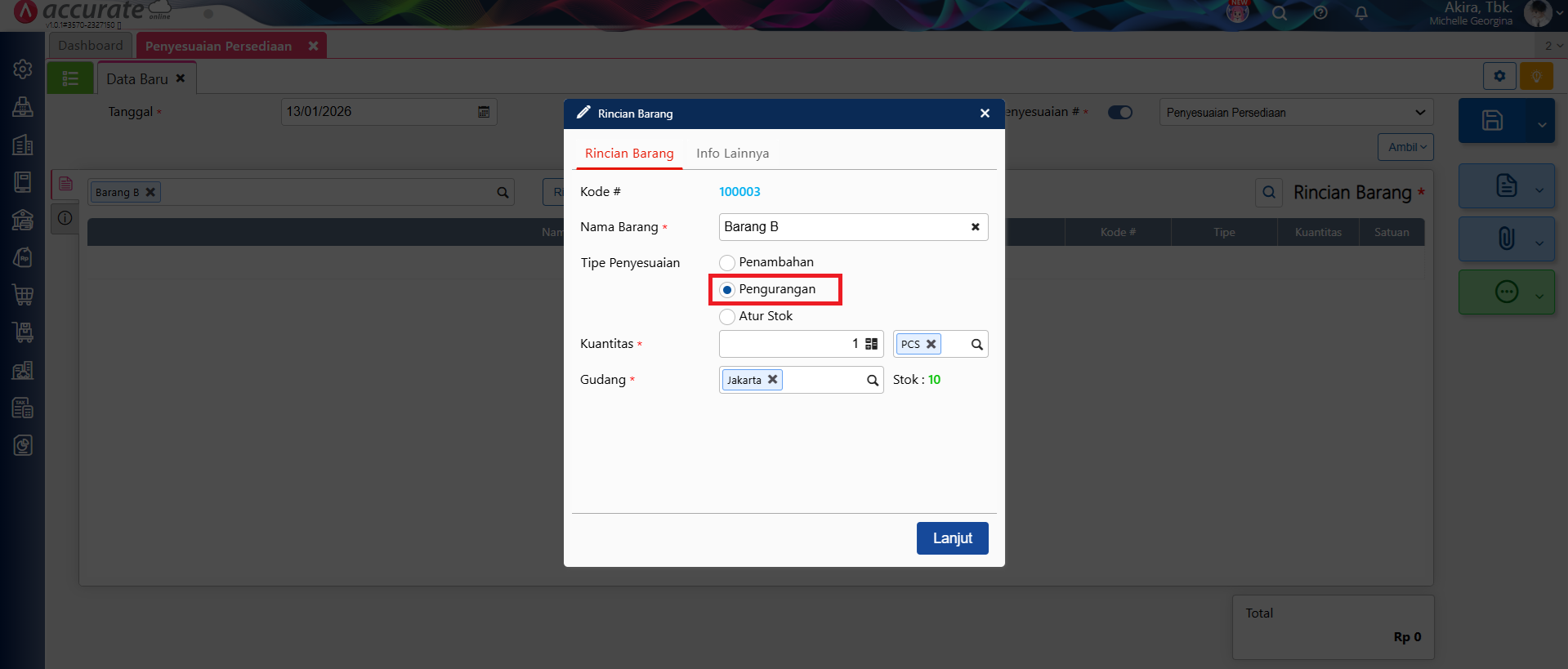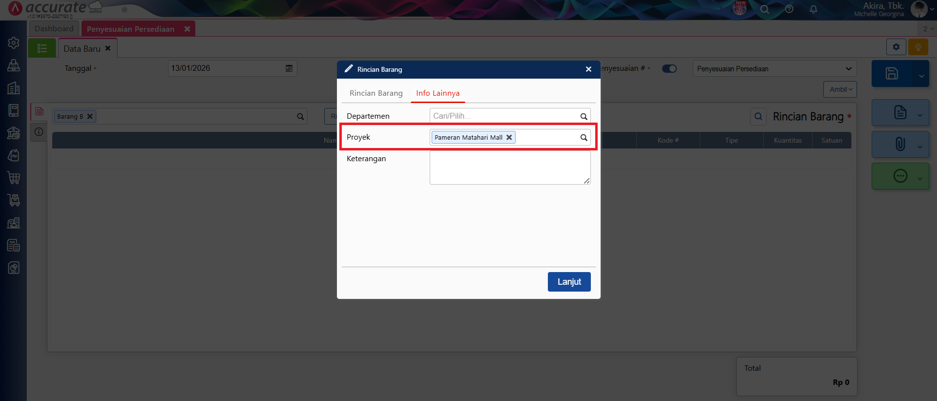 3. Akses ke menu Persediaan | Penyesuaian Persediaan, lalu isikan Barang/Bahan yang digunakan pada proyek tersebut, pilih Tipe Penyesuaian dengan ‘Pengurangan’, dan isikan kuantitas yang digunakan, lalu ke tab Info Lainnya masukan data proyek.