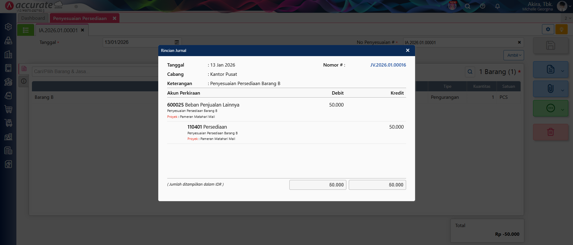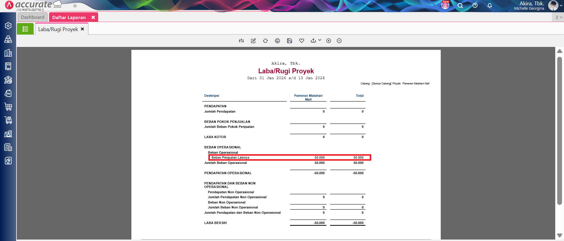 6. Nilai Beban/Biaya dari transaksi Penyesuaian Persediaan tersebut akan masuk pada Laporan Laba/Rugi Per Proyek yang dipilih.