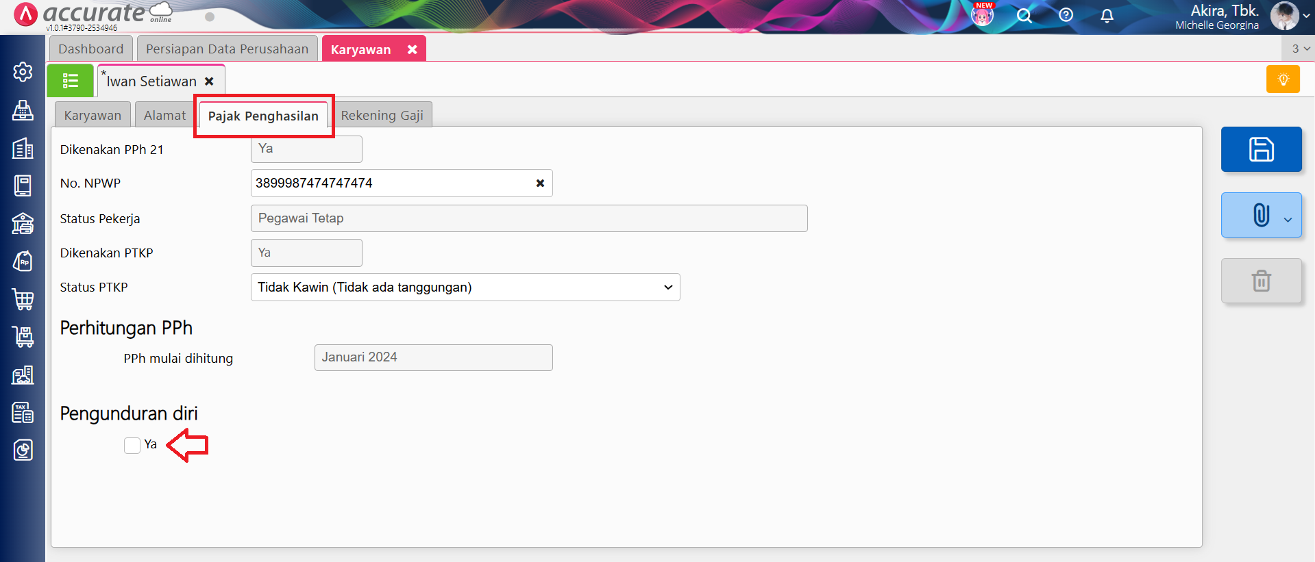 - Lalu ke tab Pajak Penghasilan dan centang Ya pada bagian Pengunduran Diri.