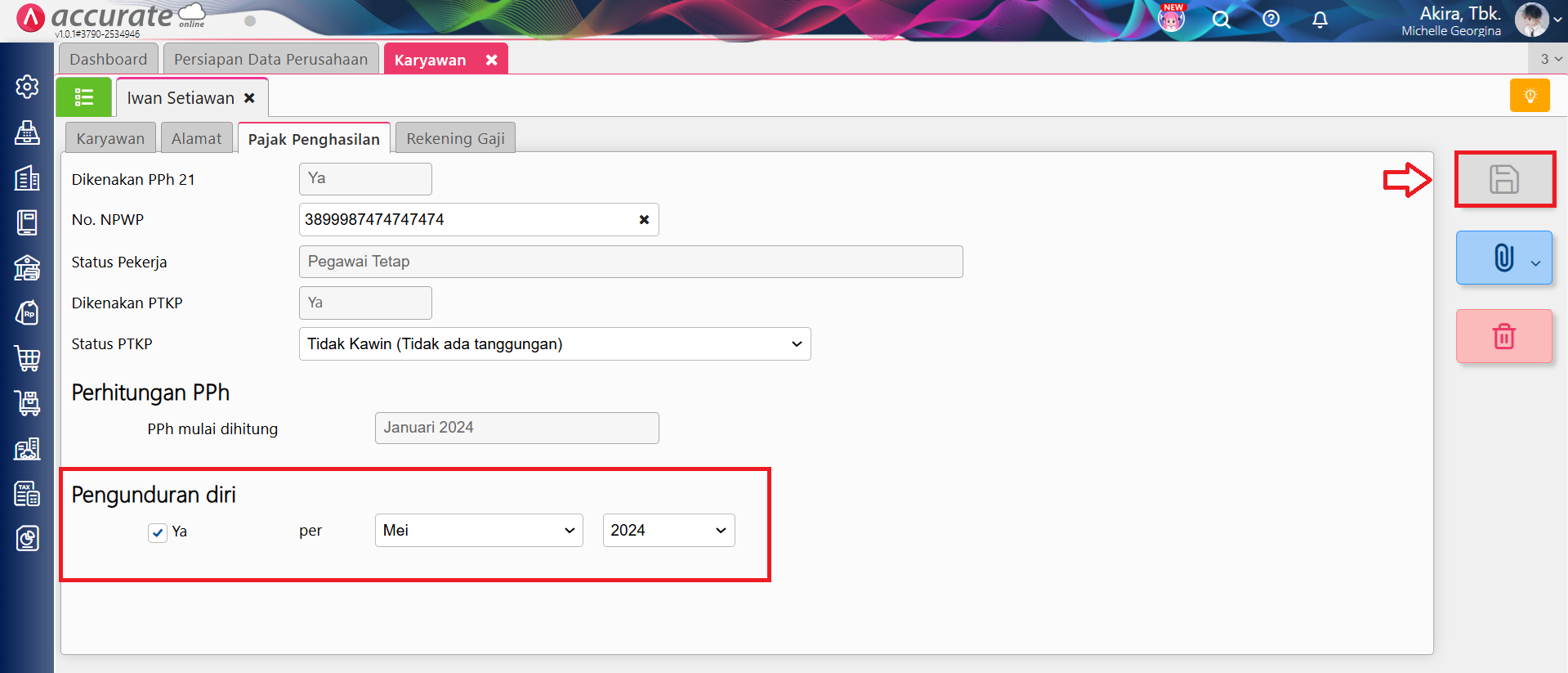 - Isikan bulan pengunduran diri dengan bulan terakhir karyawan tersebut menerima gaji dari perusahaan. Pada ilustrasi ini Iwan terima gaji terakhir di bulan Mei 2024 sehingga isikan bulan dengan Mei 2024 kemudian Simpan.