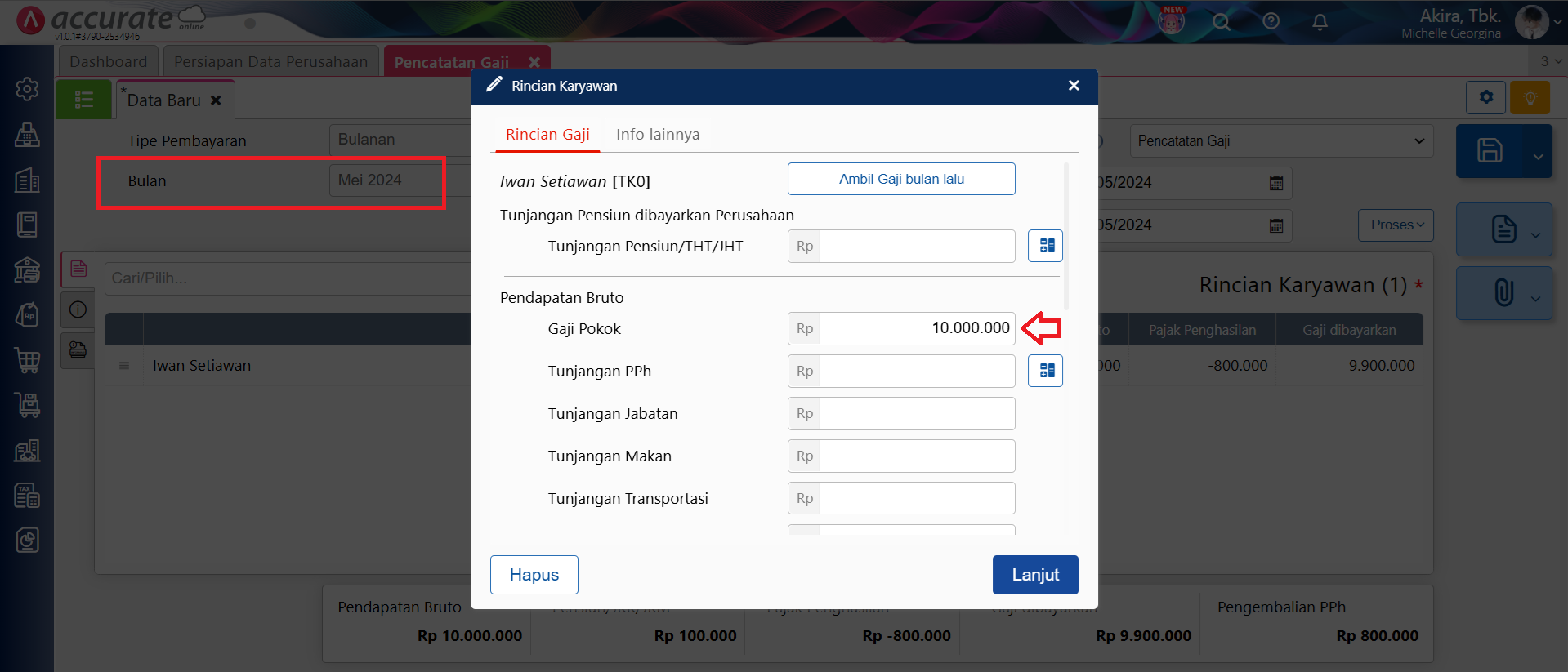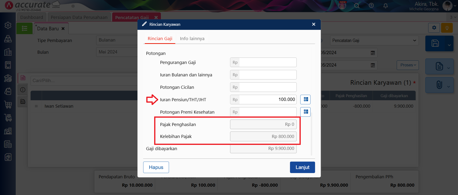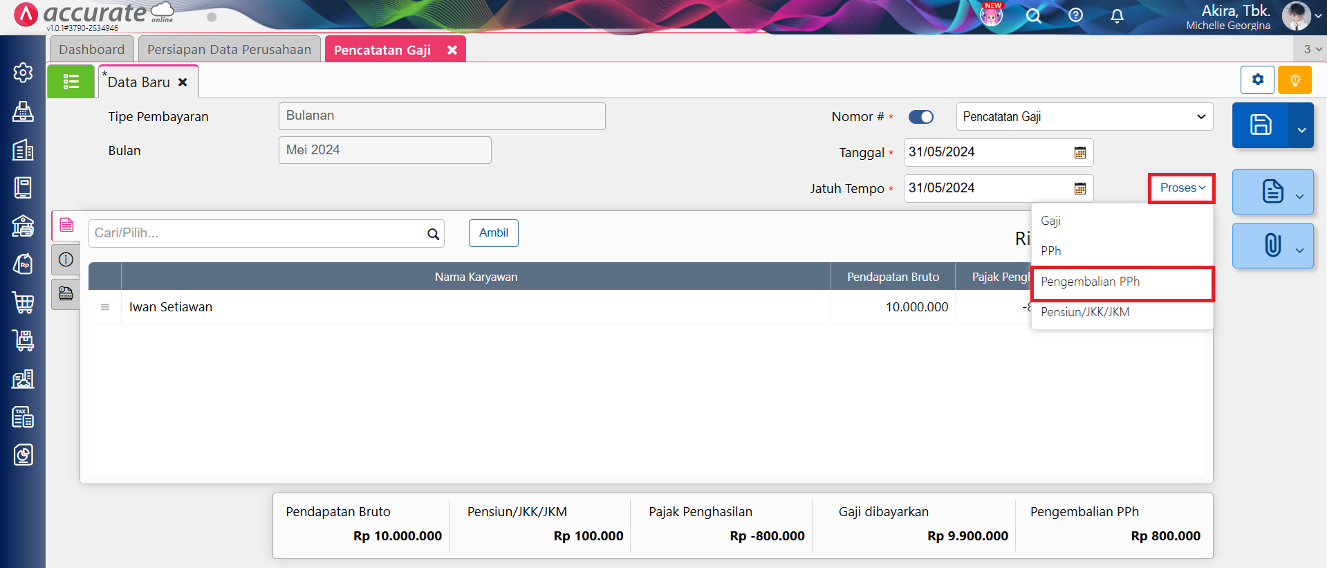 - Selanjutnya lakukan pencatatan gaji Iwan per Mei 2024 melalui menu Buku Besar | Pencatatan Gaji. Selain itu, pada pencatatan gaji Iwan bulan Mei 2024 ini akan menampilkan nilai Kelebihan Pajak senilai Rp 800.000, dan untuk pengembalian kelebihan pajak bisa dilakukan dengan cara klik Proses | Pengembalian PPh seperti disini.