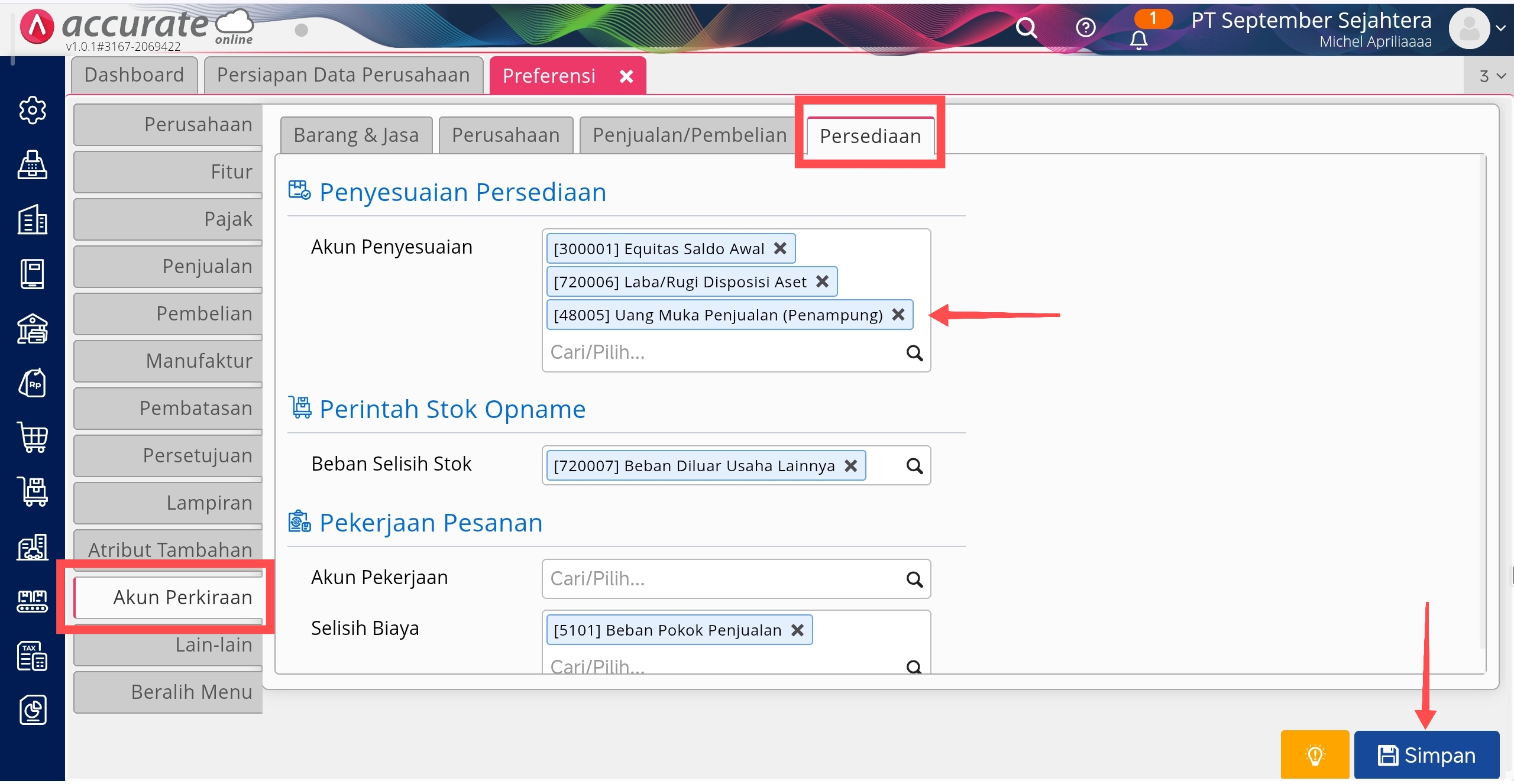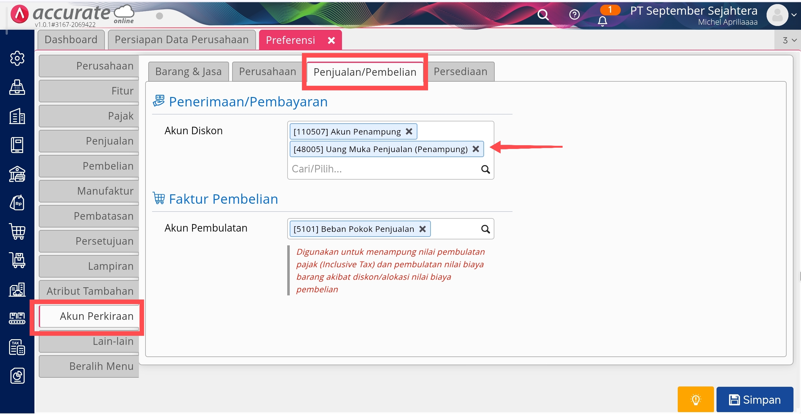 - Membuat akun perkiraan baru untuk menampung uang muka barang dengan tipe akun Beban Lainnya, seperti panduan disini. Kemudian lakukan penambahan akun tersebut ke Akun Diskon di menu Pengaturan | Preferensi | Akun Perkiraan | tab Penjualan/Pembelian. Selain menambahkan akun penampung pada akun diskon, Anda juga perlu menambahkan akun tersebut untuk Akun Penyesuaian di tab Persediaan. Lalu klik Simpan.