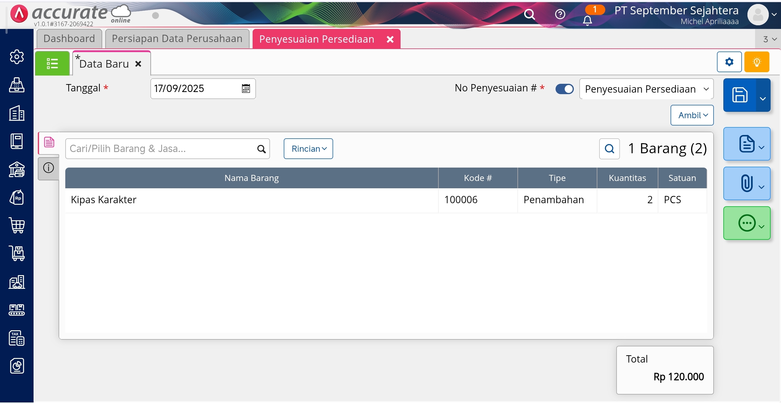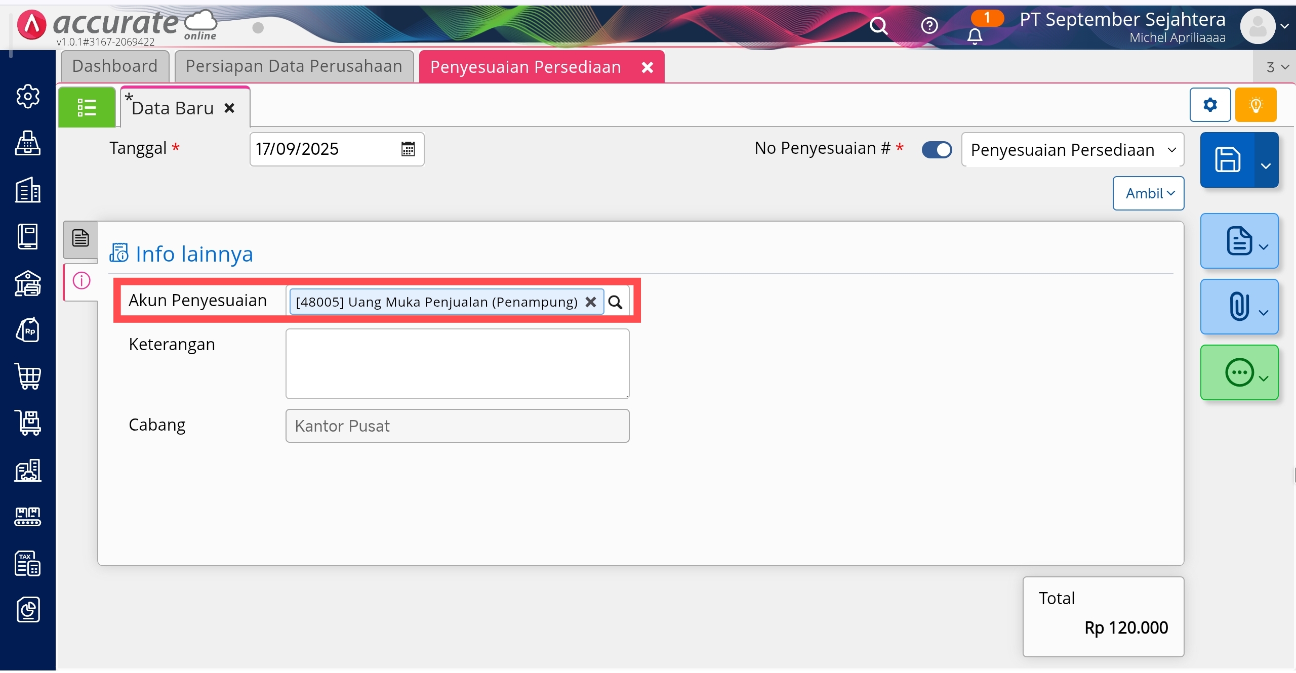 - Selanjutnya mencatat uang muka berupa barang dapat dilakukan dengan menggunakan fitur penyesuaian persediaan, pilih Tipe Penyesuaian Penambahan. Pastikan akun penyesuaian persediaan pada tab Info Lainnya diisikan dengan akun penampung uang muka penjualan sesuai dengan yang telah dibuat pada poin 1.