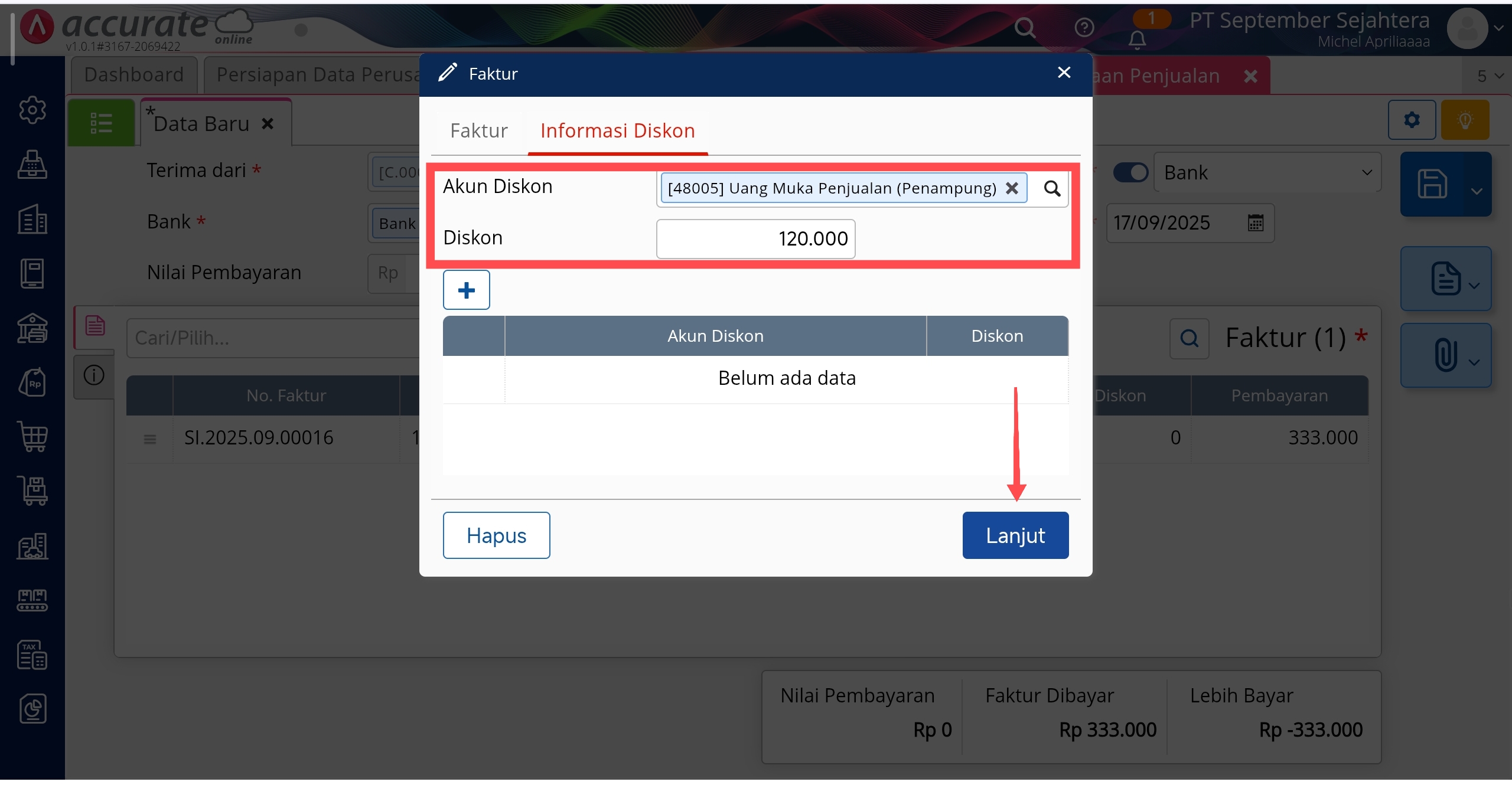 Menginput Uang Muka Berupa Barang di Informasi Diskon
