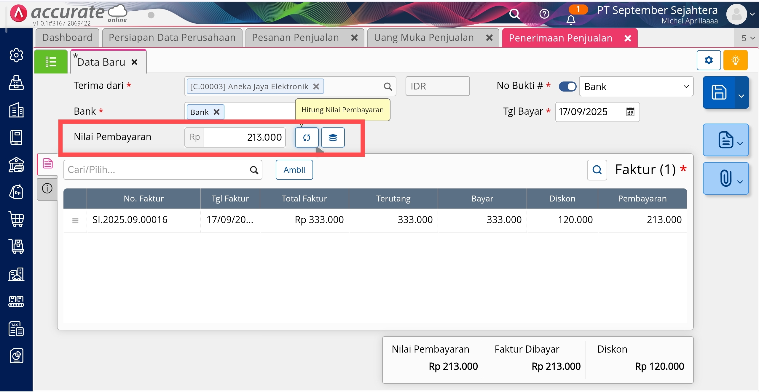 - Pada tampilan Uang Muka Penjualan, jika informasi yang dibutuhkan sudah sesuai, silahkan lakukan proses ke Pembayaran (Penerimaan Penjualan).