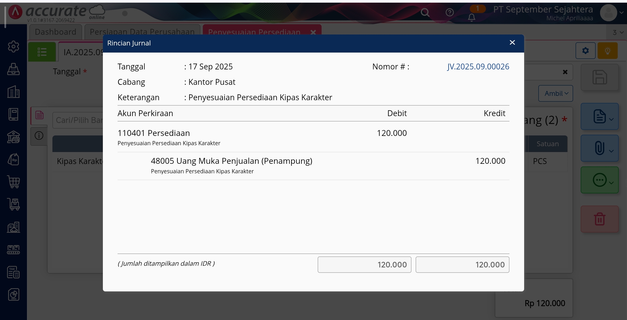 Rincian Jurnal Penyesuaian Persediaan atas Uang Muka Berupa Barang