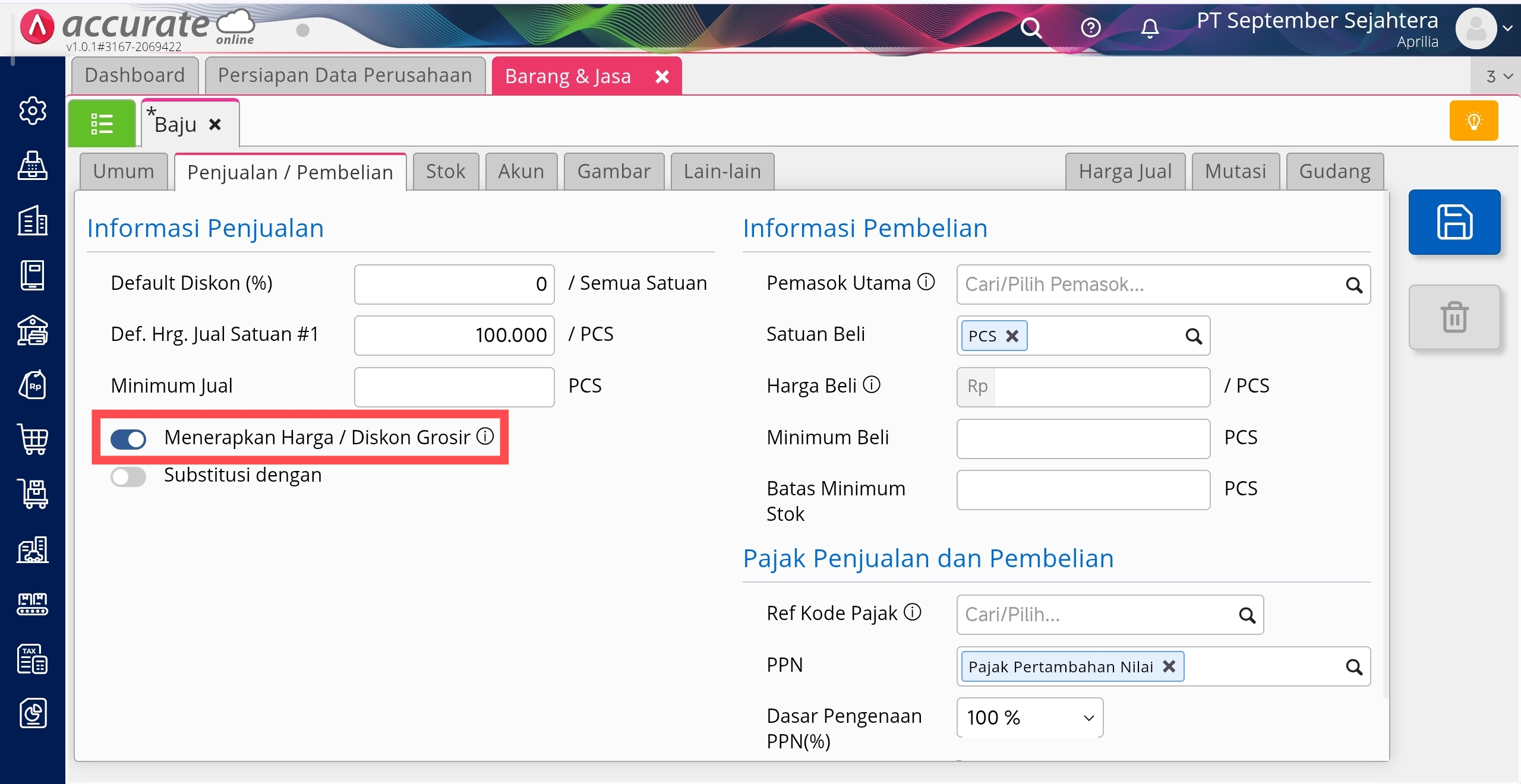 - Buka daftar barang & jasa dan pilih barang yang dimaksud, lalu ke tab Penjualan/Pembelian, pada Informasi Penjualan, aktifkan informasi Menerapkan Harga Grosir lalu Simpan.