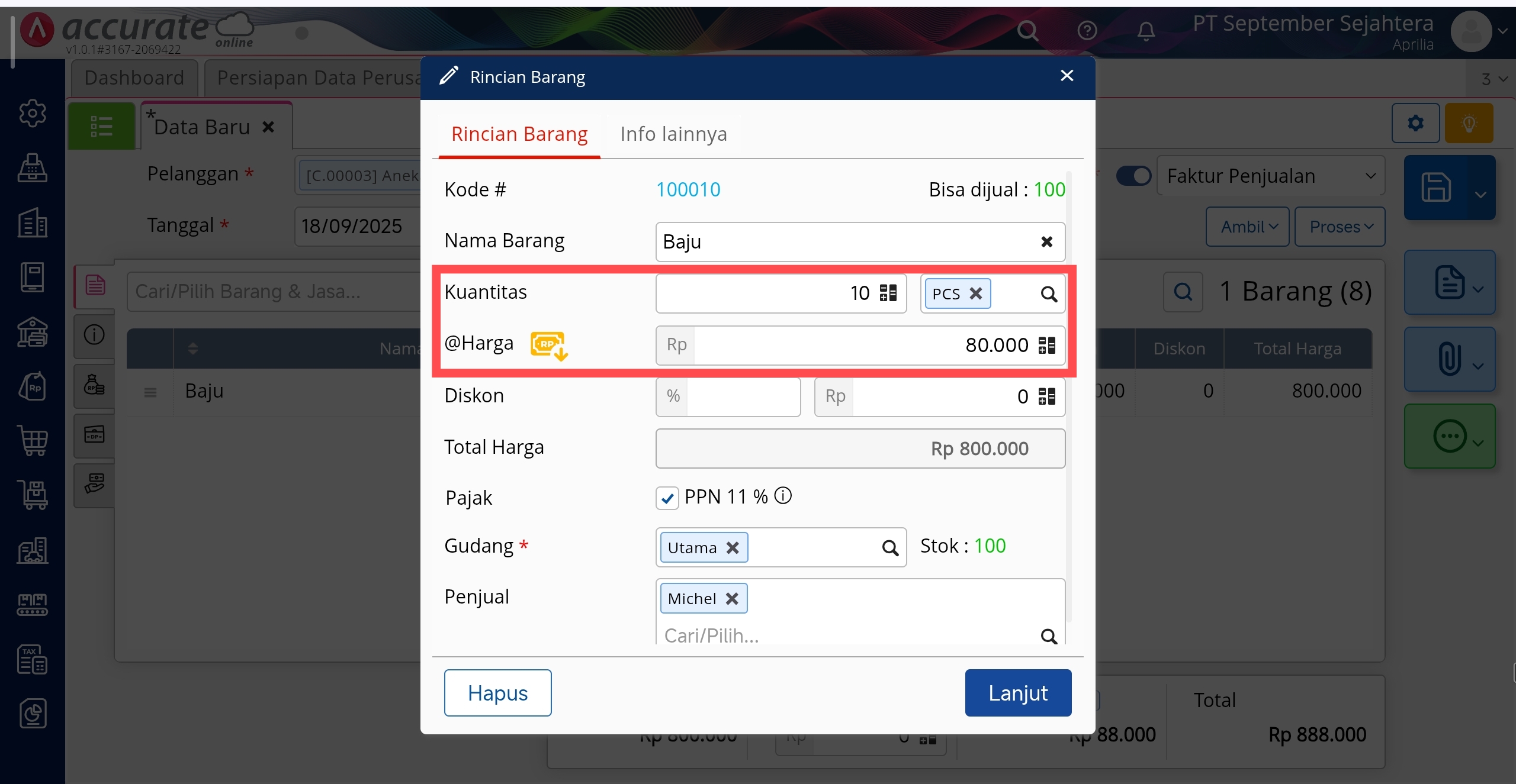 - Selanjutnya, ketika anda menginput transaksi penjualan atas persediaan Baju dengan kuantitas 10 (melebihi 8 pcs), maka harga jual per pcs persediaan Baju tersebut akan menyesuaikan dengan harga grosirnya yaitu sebesar Rp 80.000.