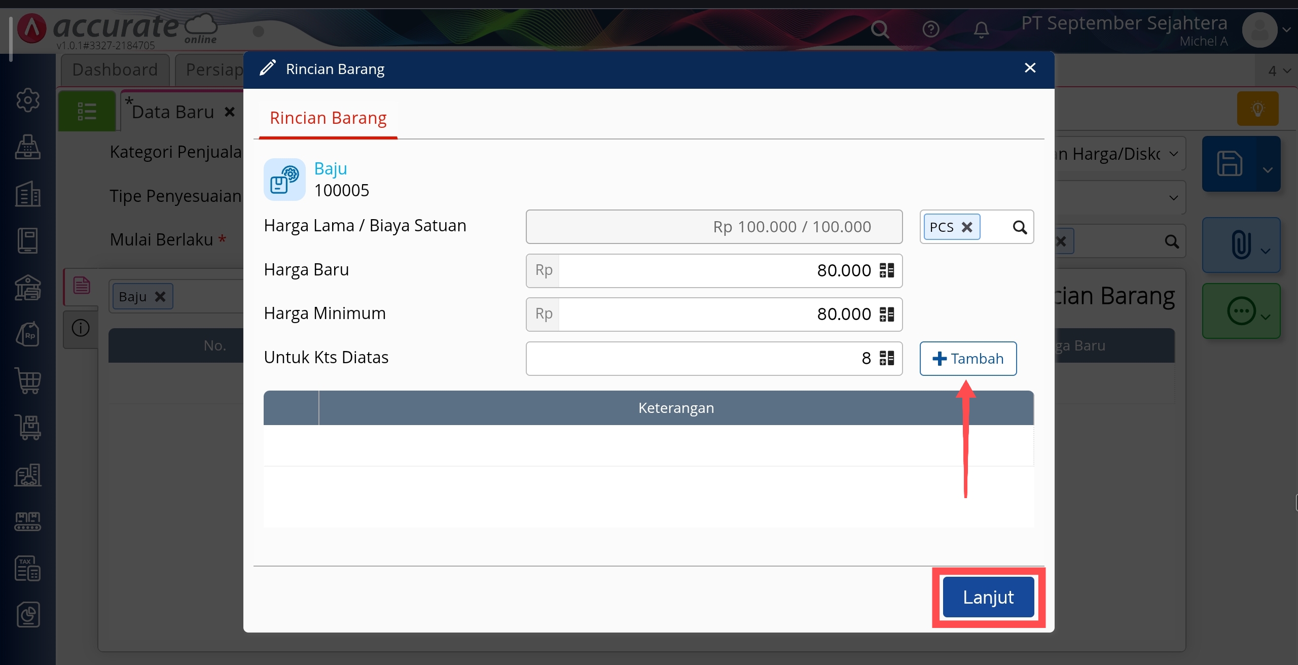 - Lengkapi formulir Penyesuaian Harga, lalu pilih barang yang dimaksud dan pada Harga Baru serta Harga Minimum inputkan Rp 80.000, lalu pada Untuk Kts Diatas isikan 8 (sesuai dengan syarat harga grosir atas barang tersebut) lalu klik Tambah dan Lanjut. Kemudian klik Simpan. Catatan: penyesuaian harga grosir untuk barang yang sama dapat dilakukan sekaligus, tanpa perlu menginputnya satu persatu.