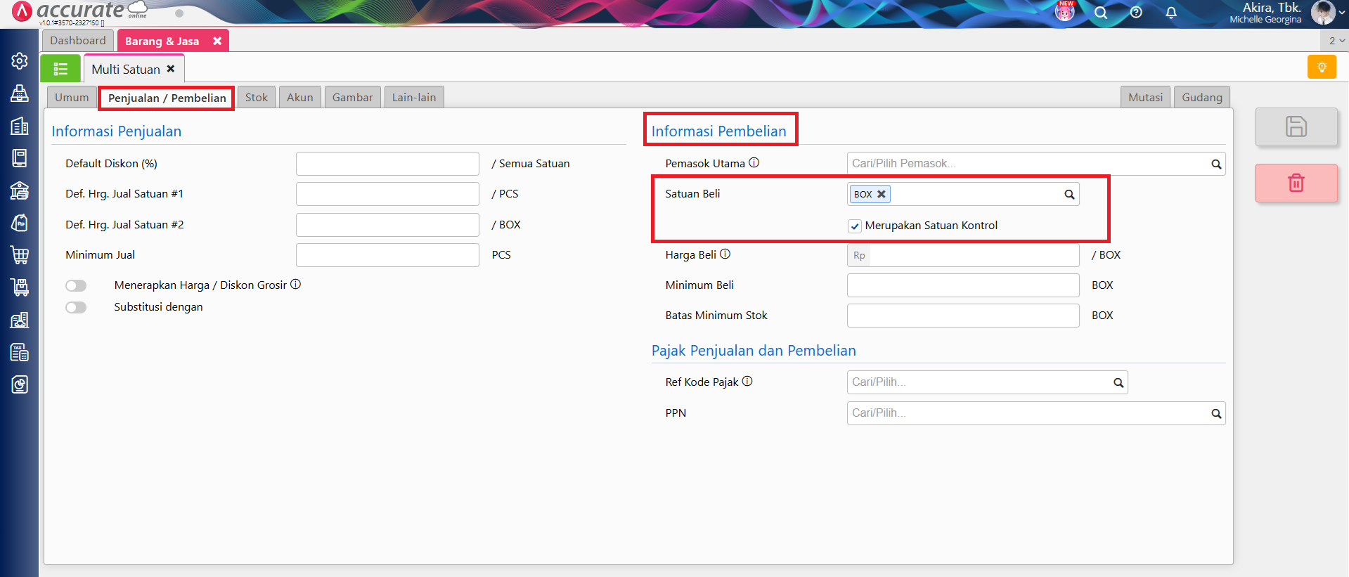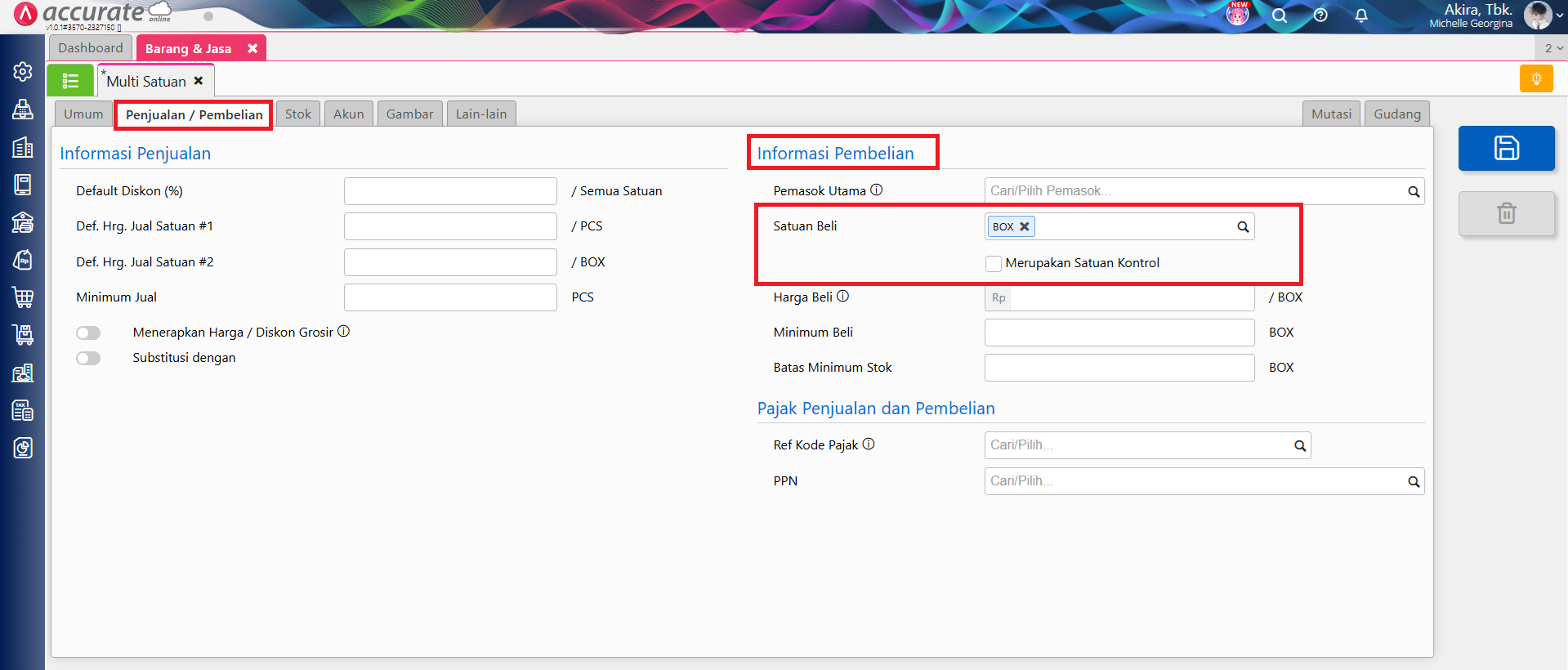 4. Lalu ke tab ‘Penjualan/Pembelian’, pilih ‘Satuan Beli’ di bagian Informasi Pembelian, dengan Satuan Kedua atau Satuan Ketiga atau Satuan diatasnya (bukan Satuan Pertama) maka akan tampil informasi ‘Merupakan Satuan Kontrol‘.