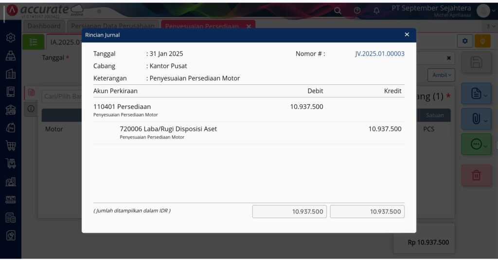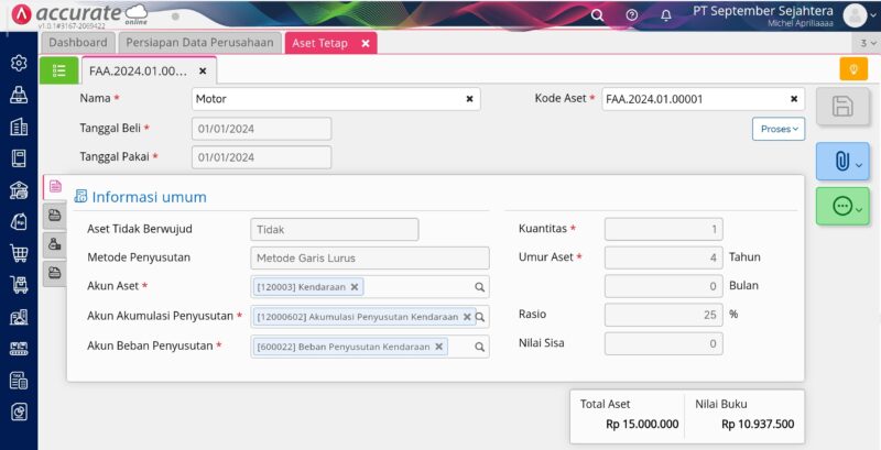 Ilustrasi : Terdapat satu unit aset tetap motor dengan tanggal pakai 01 Januari 2024 dengan harga perolehan Rp 15.000.000, umur aset 4 tahun, dan sudah disusutkan selama 1 tahun dengan sisa nilai buku aset tetap motor tersebut yaitu Rp 10.937.500. Aset tetap motor tersebut ingin dijadikan sebagai persediaan perusahaan pada tanggal 31 Januari 2025.