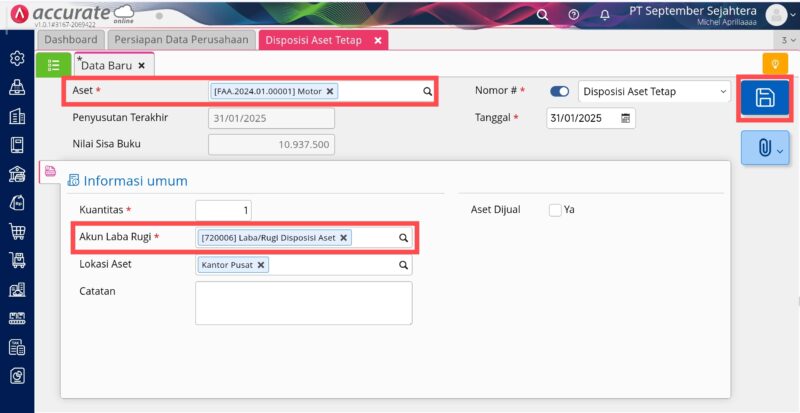 - Pilih aset tetap motor yang ingin diakui sebagai persediaan tersebut. Pada akun laba rugi, pilih akun yang akan digunakan sebagai akun penampung Laba/Rugi atas transaksi disposisi tersebut. Misalnya adalah akun Laba/Rugi Disposisi Aset.