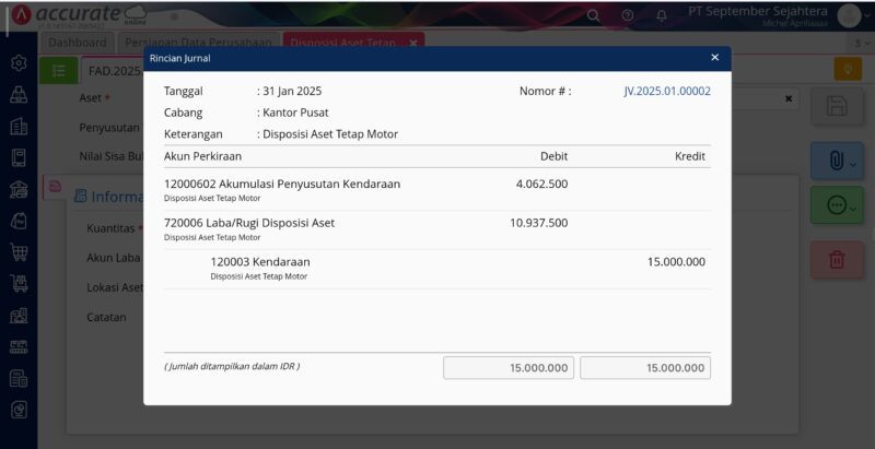 - Simpan transaksi disposisi aset tetap dan jurnal yang terbentuk adalah sebagai berikut.