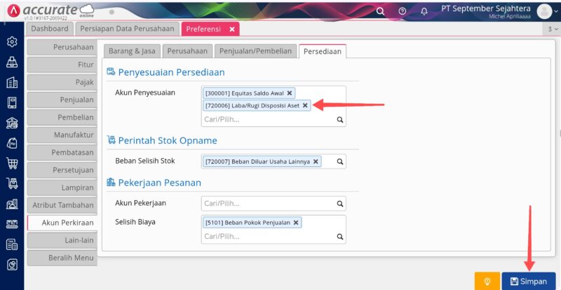 - Tambahkan akun yang sama dengan akun laba/rugi yang digunakan pada transaksi Disposisi Aset Tetap, yaitu akun Laba/Rugi Disposisi Aset ke dalam akun perkiraan untuk transaksi Penyesuaian Persediaan, melalui menu Pengaturan | Preferensi | Akun Perkiraan | Persediaan | Akun Penyesuaian.