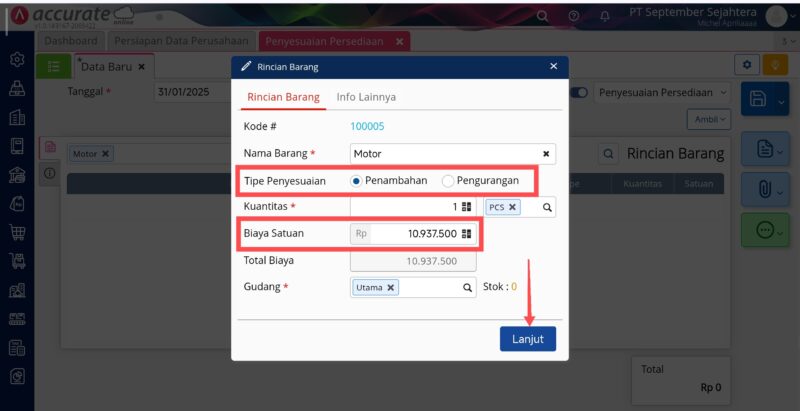 - Buat transaksi Penyesuaian Persediaan melalui menu Persediaan dan pilih Tipe Penyesuaiannya adalah Penambahan. Isikan tanggal transaksi Penyesuaiaan Persediaan dengan tanggal yang sama dengan tanggal disposisi Aset Tetap yaitu tanggal 31 Januari 2025, cari/pilih barang (persediaan) Motor, dan isikan nilai persediaannya sebesar Rp 10.937.500, sesuai dengan nilai buku dari aset tetap tersebut.