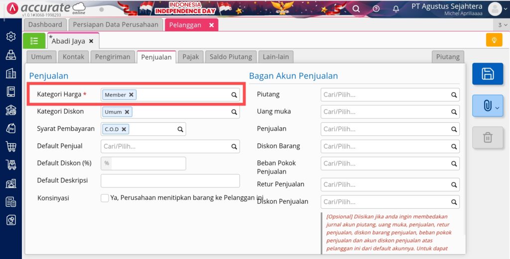 2. Mengatur Kategori Harga Barang dari Pelanggan, caranya dari Modul Penjualan | Pelanggan, kemudian pada Formulir Data Pelanggan ke tab Penjualan, pada Kategori Harga pilih kategori harga yang sesuai untuk Pelanggan tersebut.