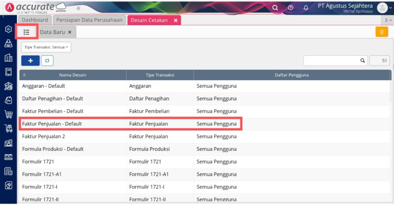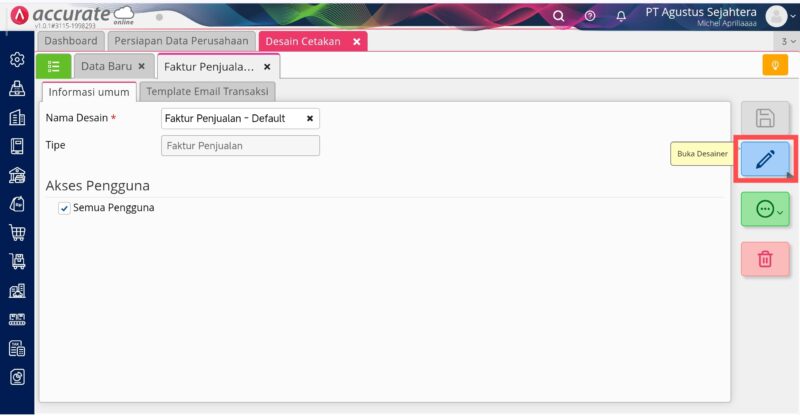 - Buka daftar desain cetakan dan pilih nama Desain Cetakan yang akan diatur tinggi tabel barangnya (misalnya Desain Cetakan Faktur Penjualan), lalu klik Buka Desainer (gambar pensil).