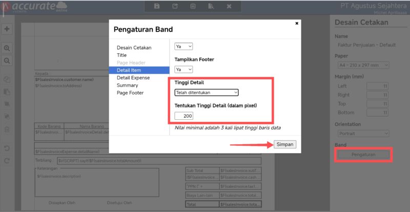 - Klik Pengaturan (bagian bawah Band) | Detail Item, pada bagian Tinggi detail pilih Telah ditentukan kemudian isikan tinggi detail yang diinginkan pada bagian Tentukan Tinggi Detail.