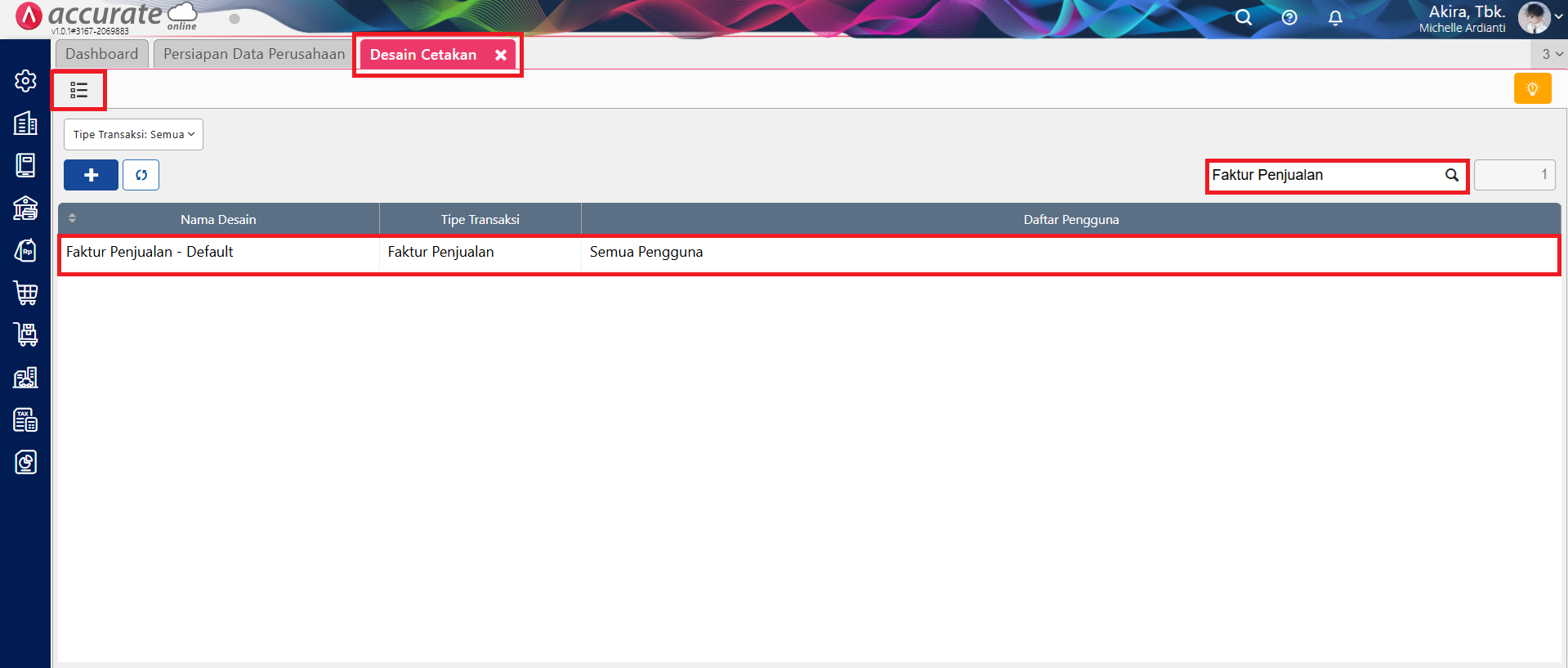 - Ke menu Pengaturan | Desain Cetakan, lalu klik tombol Daftar berwarna hijau di samping tab Data Baru, dan lakukan pencarian atas desain cetakan Faktur Penjualan yang dimaksud.