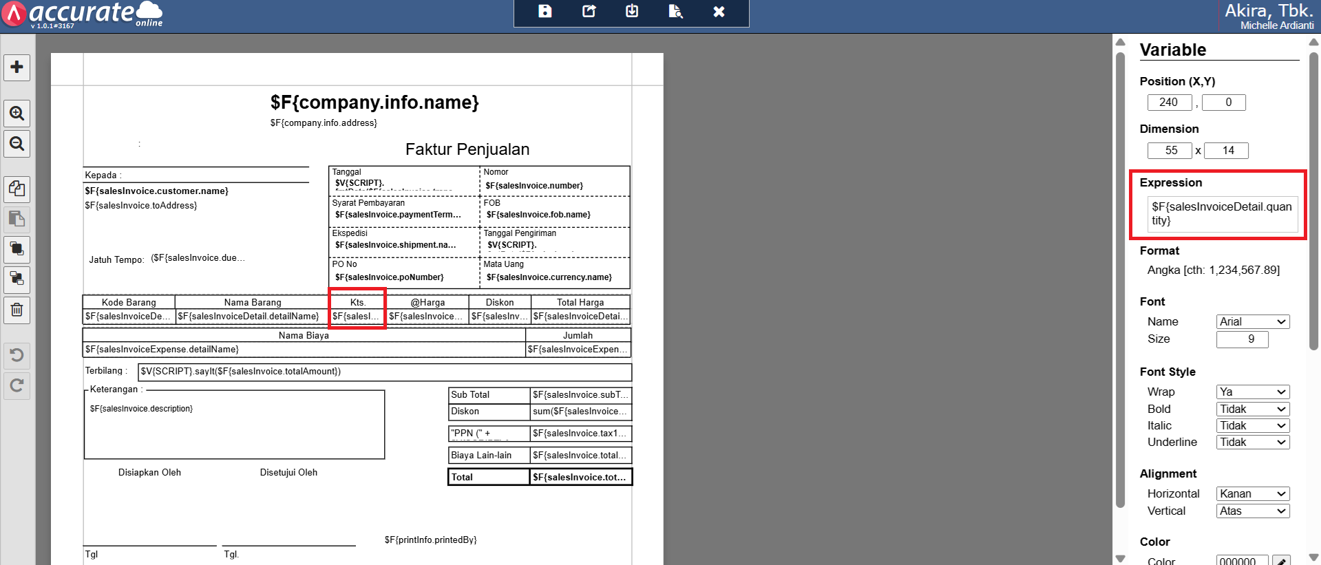 Berikut langkah-langkah untuk menggabungkan tampilan kolom kuantitas dan satuan pada desain cetakan Faktur Penjualan di Accurate Online: