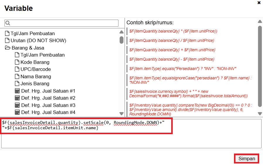 - Kemudian, klik dua kali pada kolom ‘Kts‘ dan inputkan skrip rumus $F{salesInvoiceDetail.quantity}.setScale(0, RoundingMode.DOWN)+” “+$F{salesInvoiceDetail.itemUnit.name} untuk menggabungkan informasi Kuantitas dan Satuan pada desain cetakan, lalu klik Simpan.