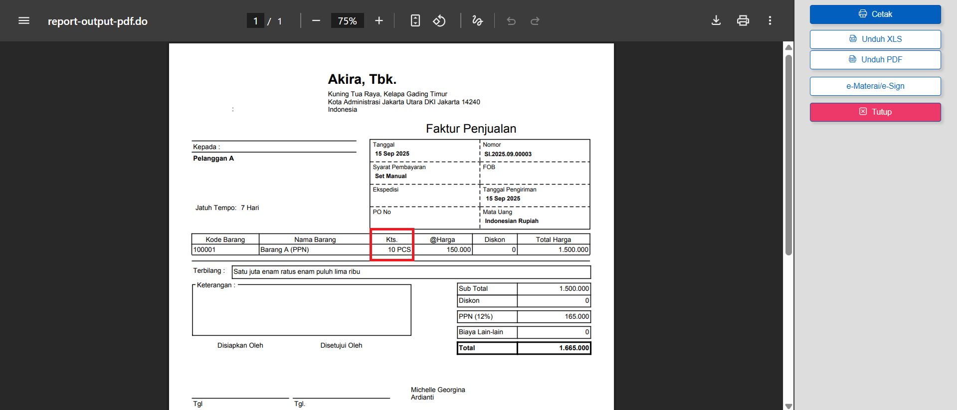 Hasil cetak transaksi dengan informasi Kuantitas dan Satuan pada kolom ‘Kts’