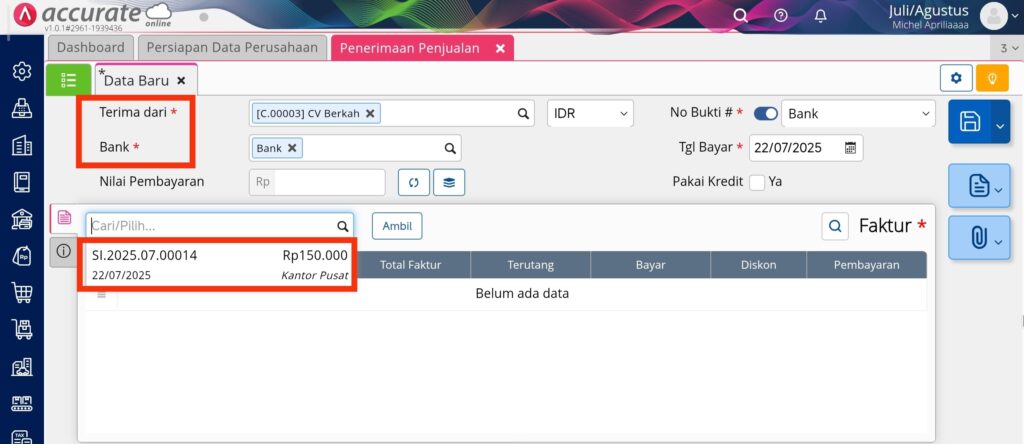 - Buka menu Penjualan | Penerimaan Penjualan, kemudian pilih nama pelanggan yang dimaksud dan lengkapi informasi Penerimaan Penjualan, kemudian pilih Nomor Faktur Penjualan yang akan dipotong nilai pembayarannya dengan nilai overpay sebelumnya.