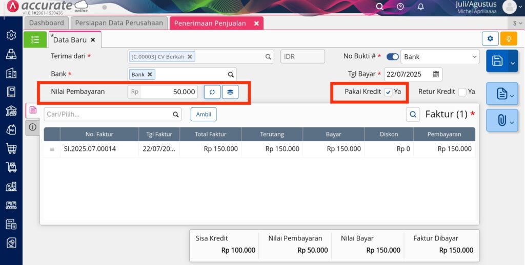 - Centang “Ya” pada “Pakai Kredit” kemudian klik “Hitung Nilai Pembayaran”, maka nilai faktur penjualan tersebut otomatis sudah dikurangi oleh nilai overpay nya. Simpan transaksi untuk melanjutkan.