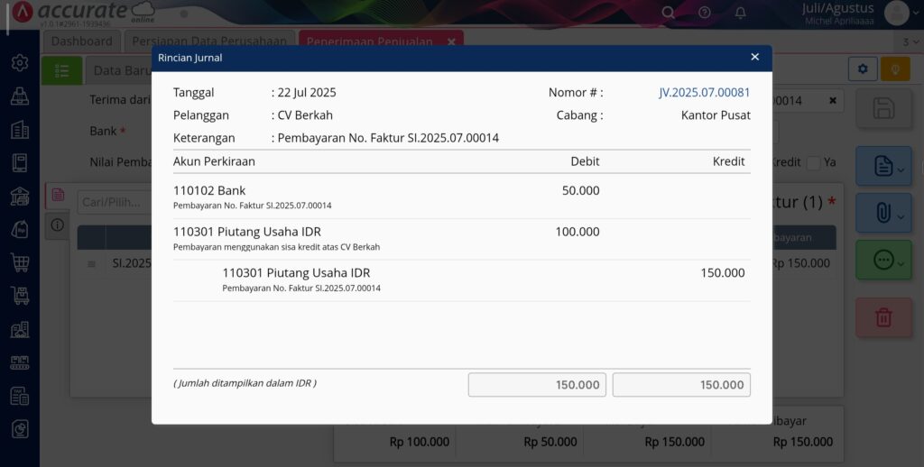 3. Berikut Jurnal Penerimaan Penjualan yang terbentuk atas transaksi tersebut.