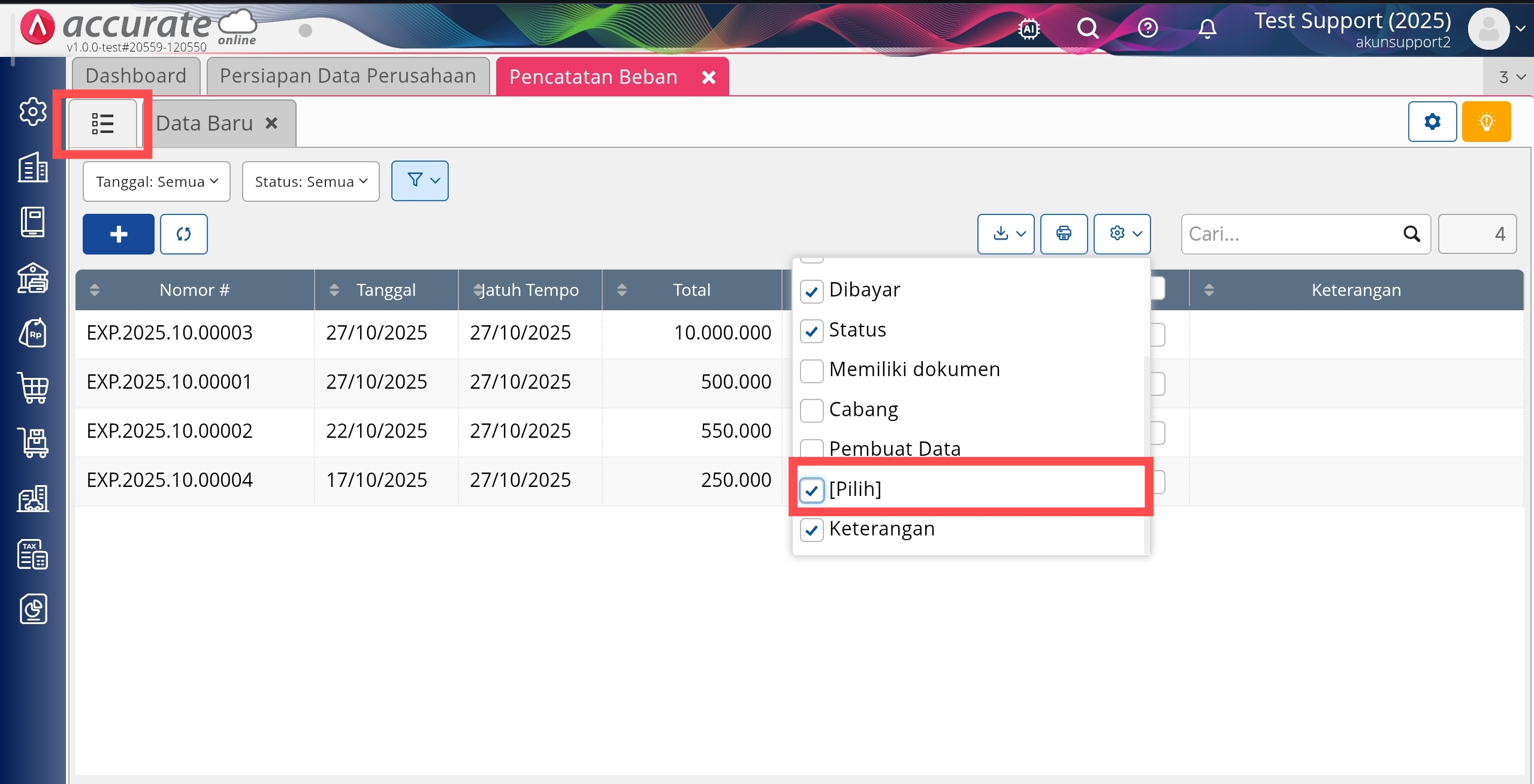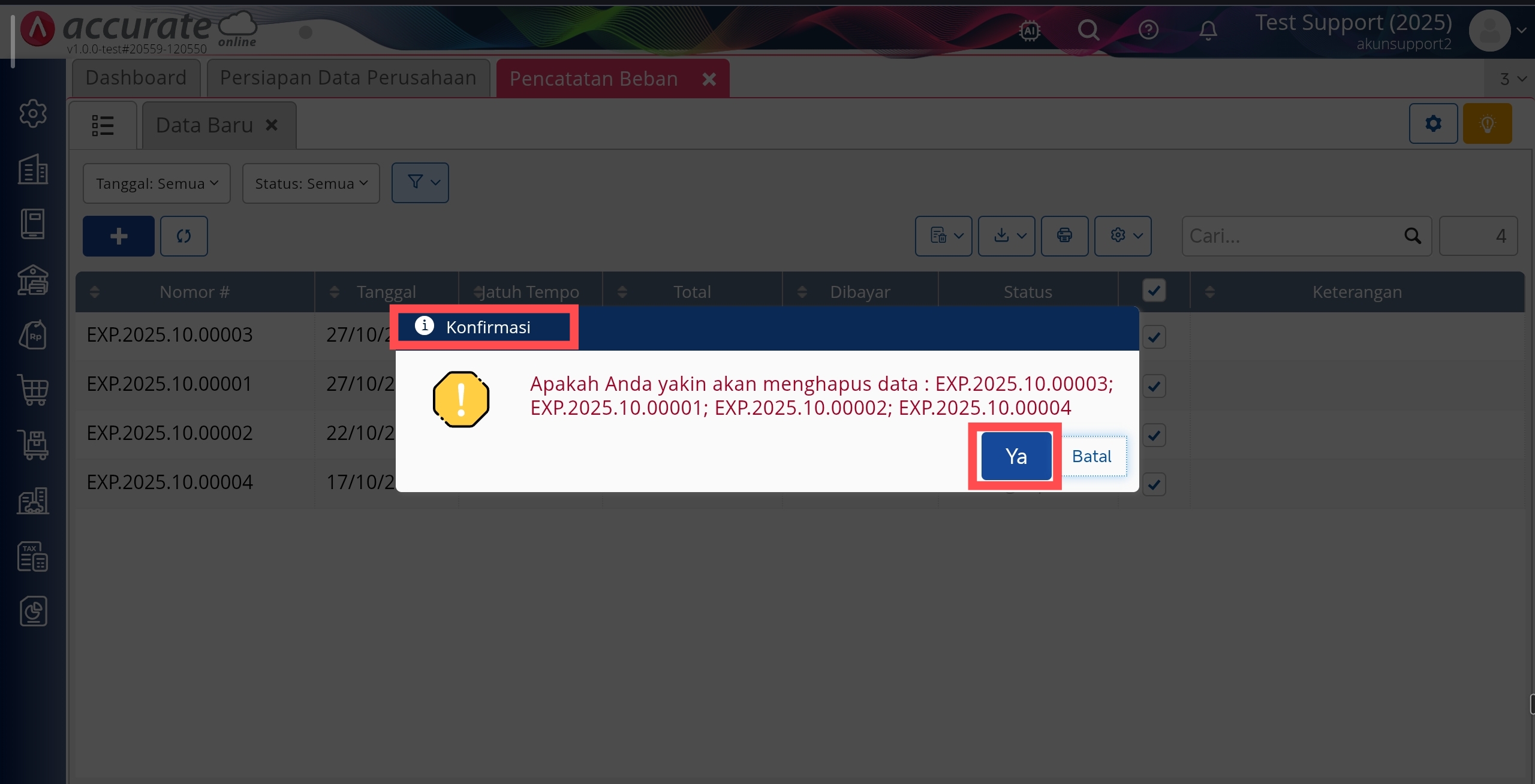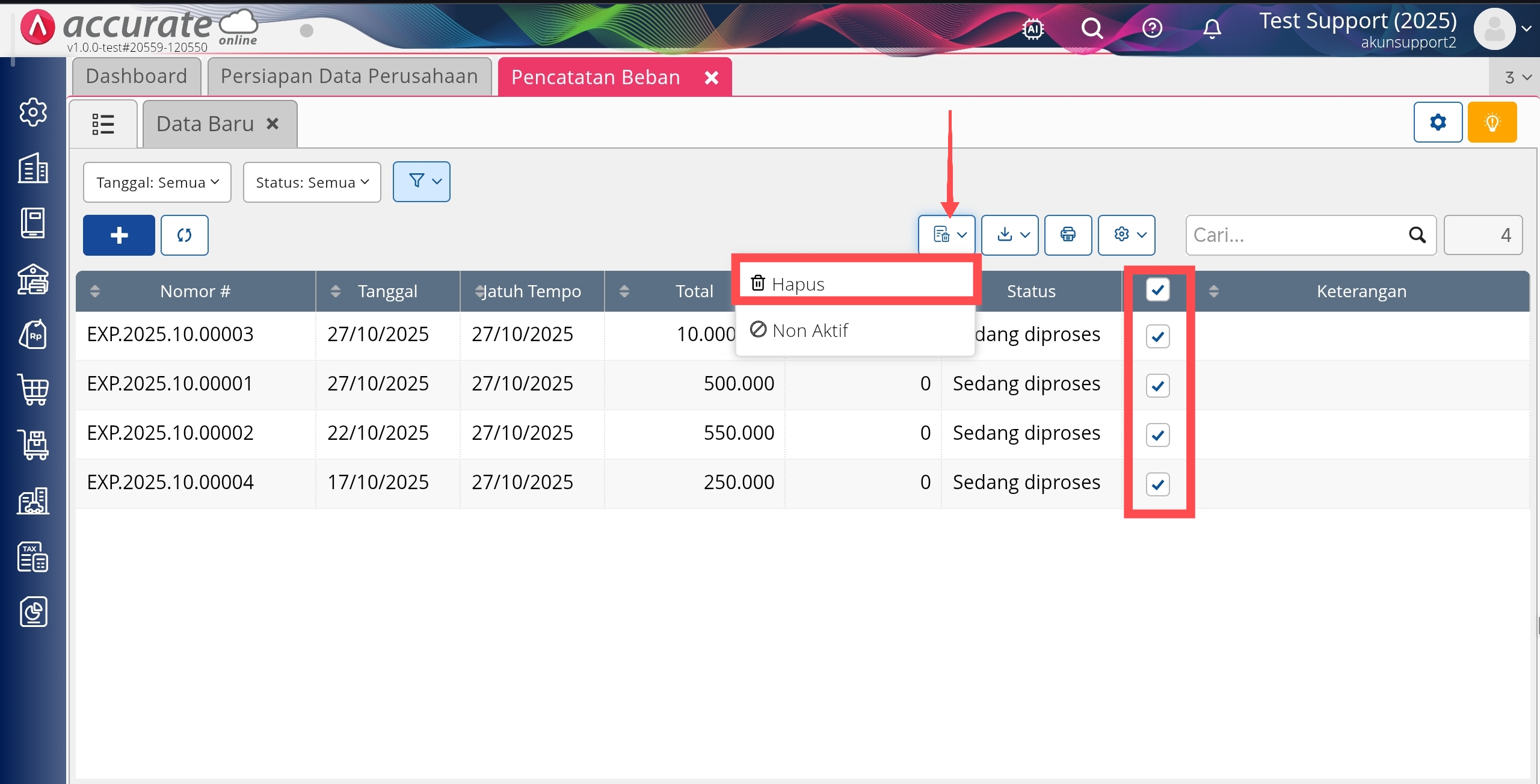 Berikut langkah-langkah untuk menghapus transaksi Pencatatan Beban secara massal :
