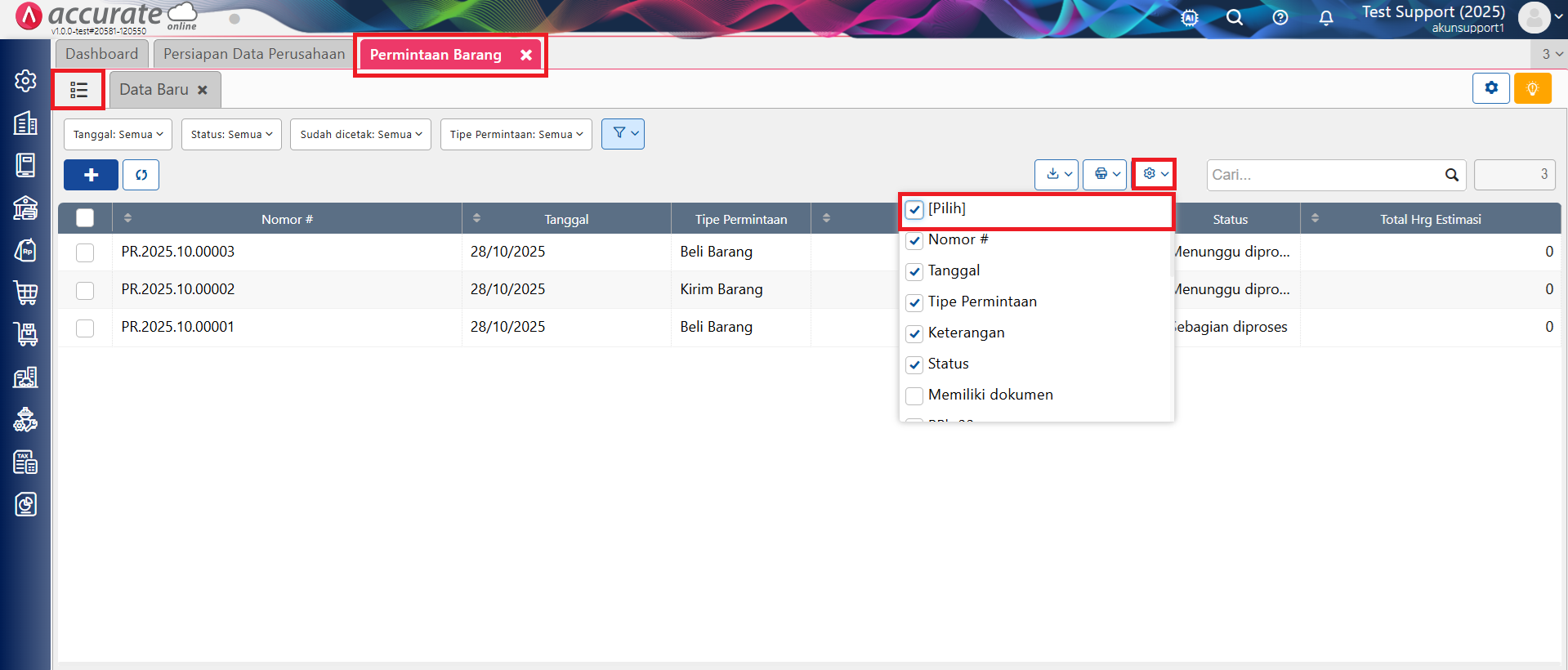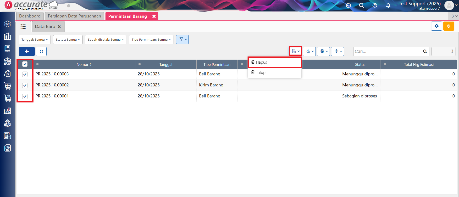 Berikut langkah-langkah untuk menghapus transaksi Permintaan Barang secara massal di Accurate Online:
