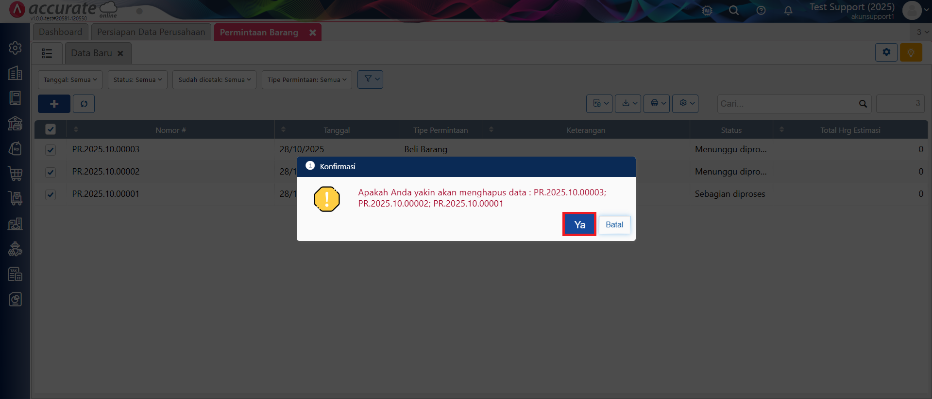 - Klik Ya pada pesan konfirmasi yang tampil untuk melanjutkan proses hapus Permintaan Barang.