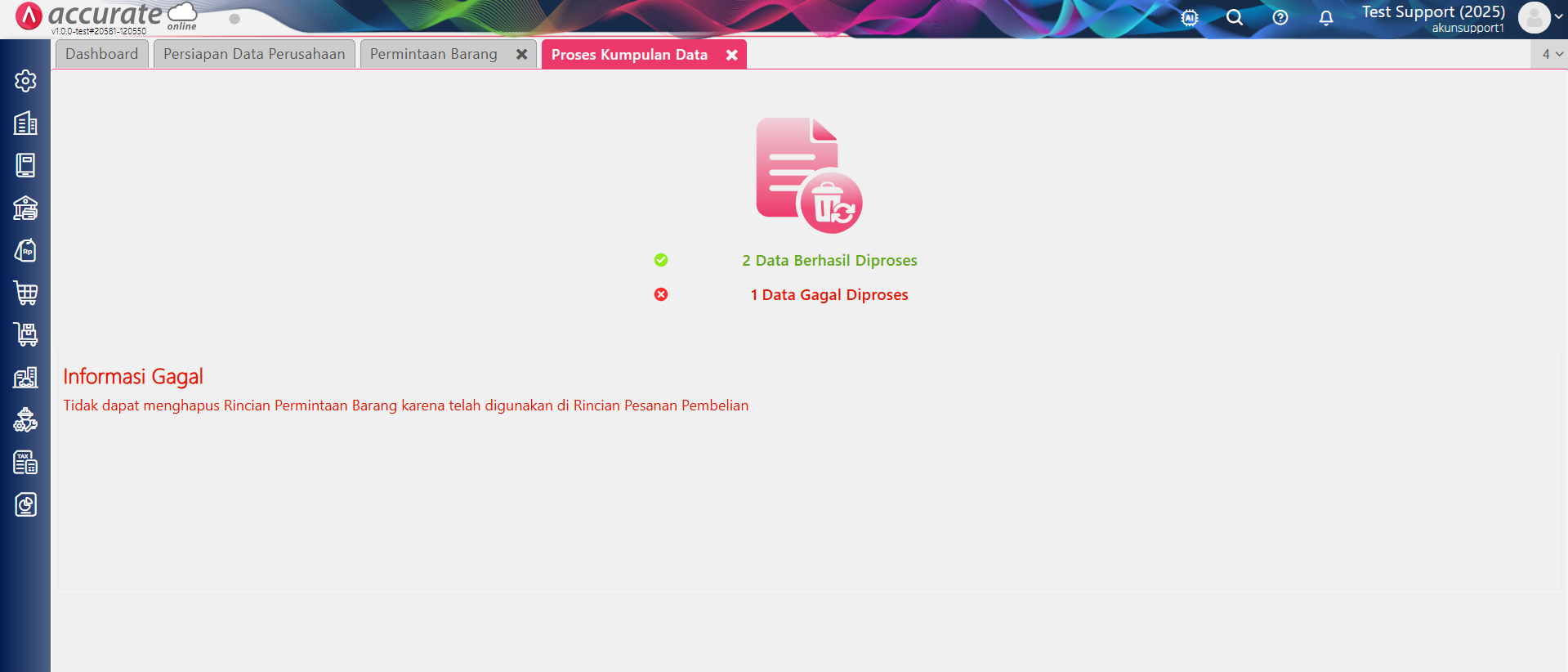 Catatan: Transaksi Permintaan Barang yang dapat dihapus adalah transaksi yang status nya ‘Menunggu Diproses‘ atau belum diteruskan ke transaksi selanjutnya. Jika transaksi permintaan barang statusnya ‘Terproses‘ atau ‘Sebagian diproses‘, maka pada saat proses hapus akan tampil Data Gagal Diproses dan Informasi Gagalnya.