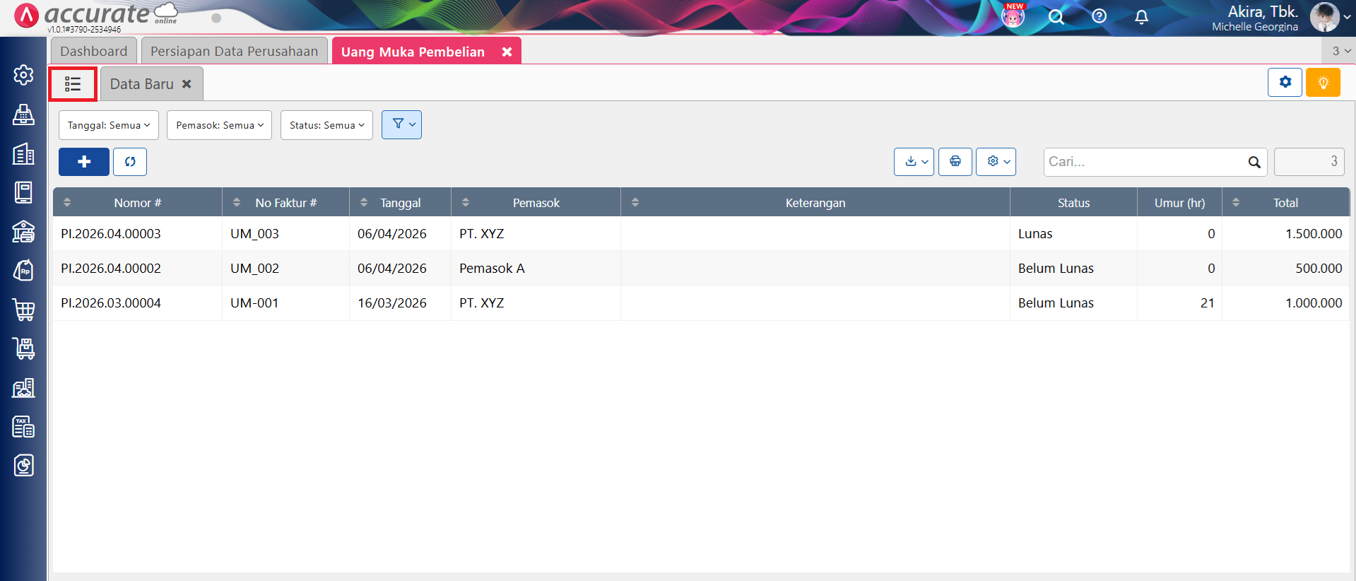 - Ke menu Pembelian | Uang Muka Pembelian, lalu ke tab Daftar Uang Muka Pembelian.