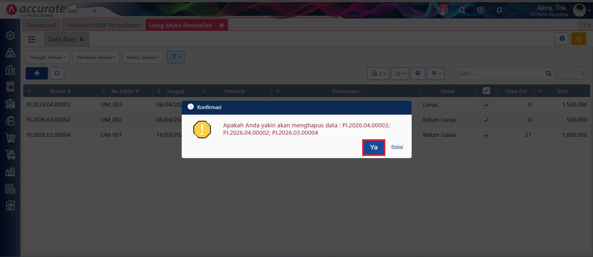 - Klik Ya pada pesan konfirmasi yang tampil untuk melanjutkan proses hapus uang muka pembelian.