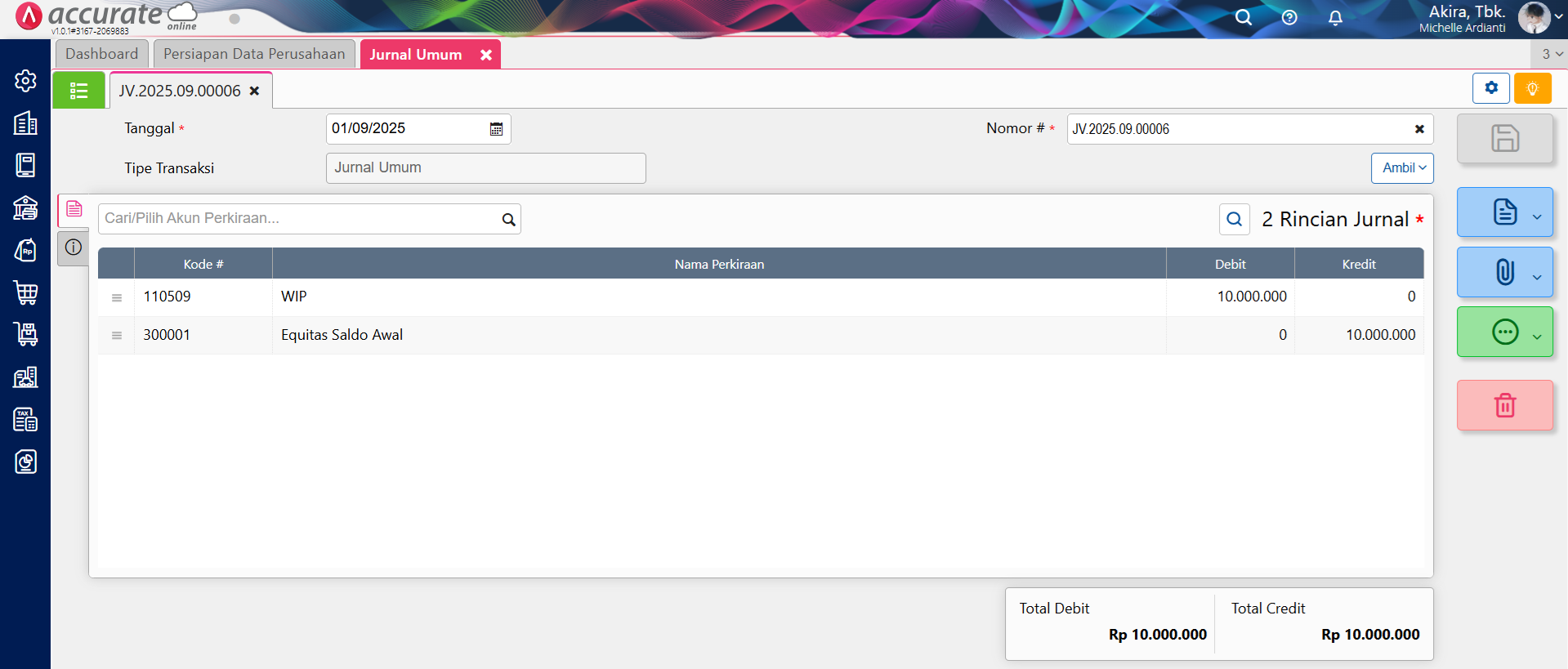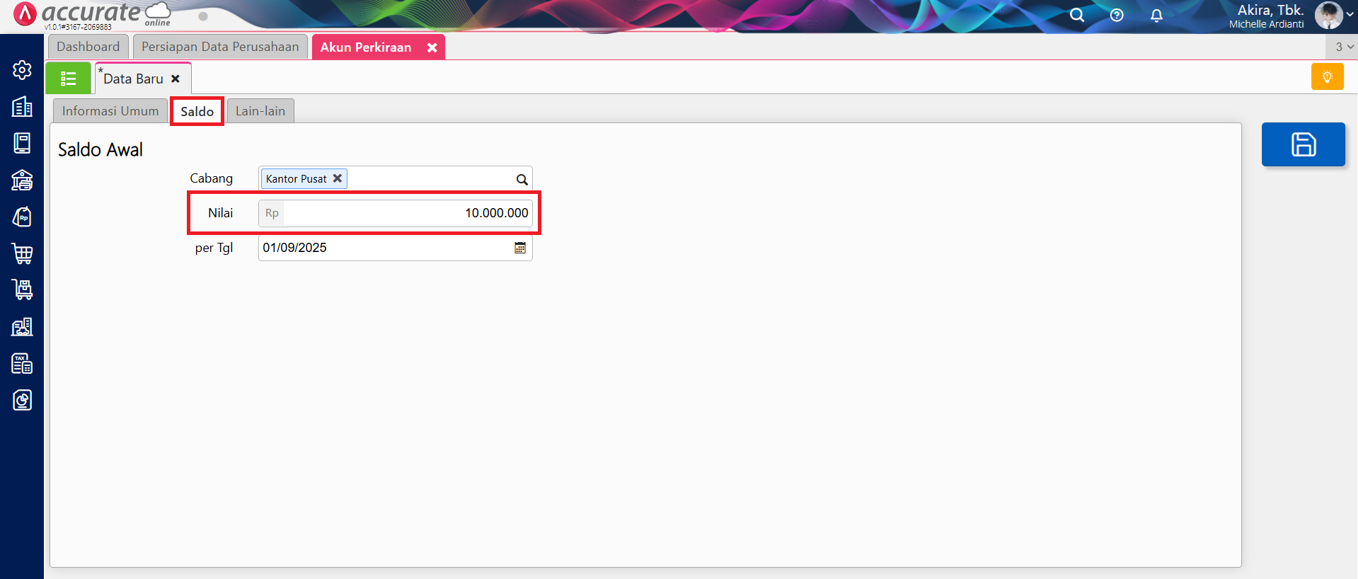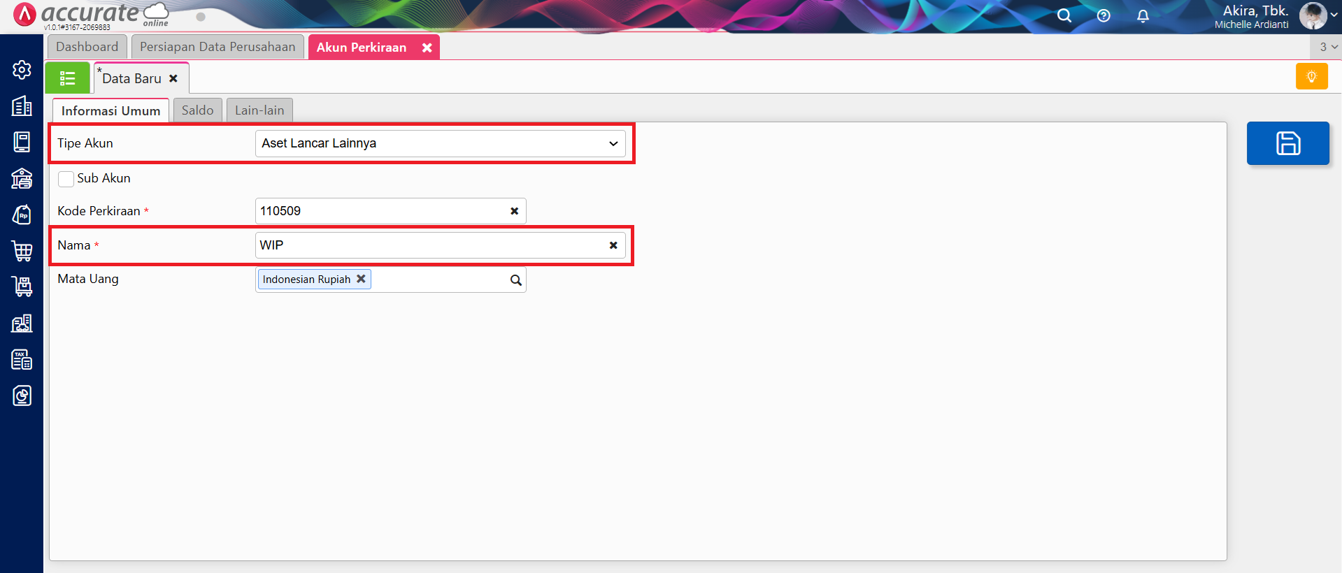 1. Membuat Akun Perkiraan Baru sebagai akun penampung, dengan tipe akun ‘Aset Lancar Lainnya’ dan Nama Akun yang sesuai, misalnya WIP. Kemudian, isikan nilai saldo akun Persediaan Dalam Proses tersebut pada tab Saldo, lalu klik Simpan.