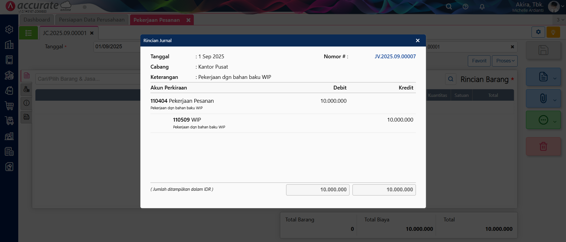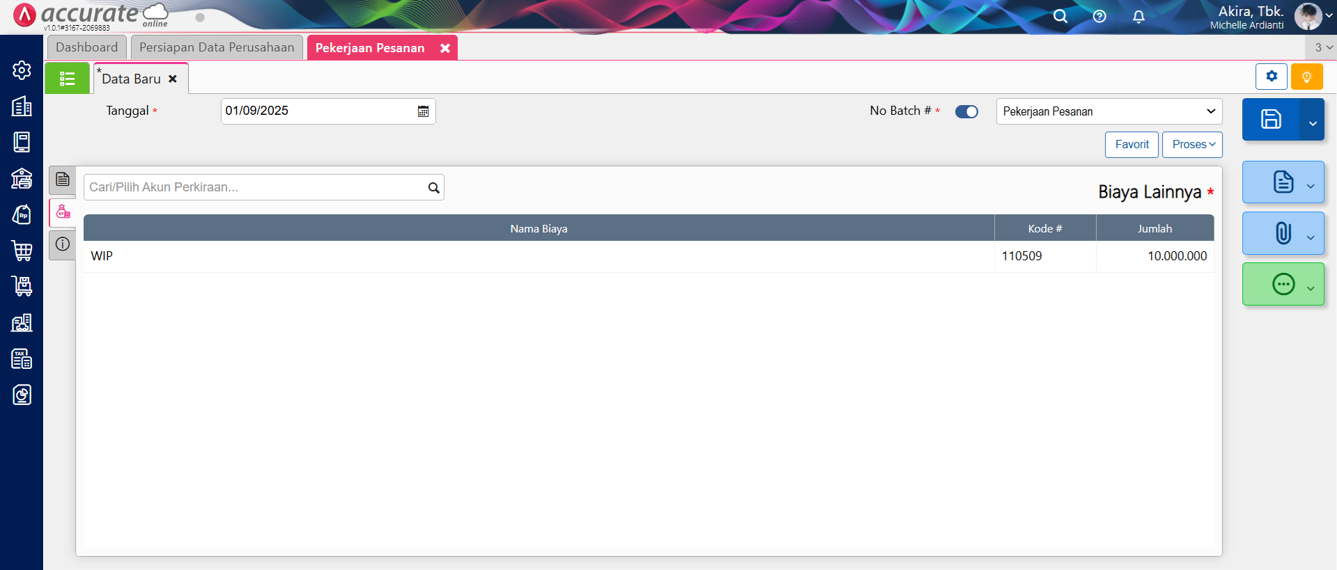 2. Selanjutnya, buat transaksi Pekerjaan Pesanan melalui menu Persediaan ke tab Rp (Biaya Lainnya), pilih akun penampung pada poin 1, dan isikan nominalnya senilai saldo Persediaan Dalam Proses seperti pada poin 1.